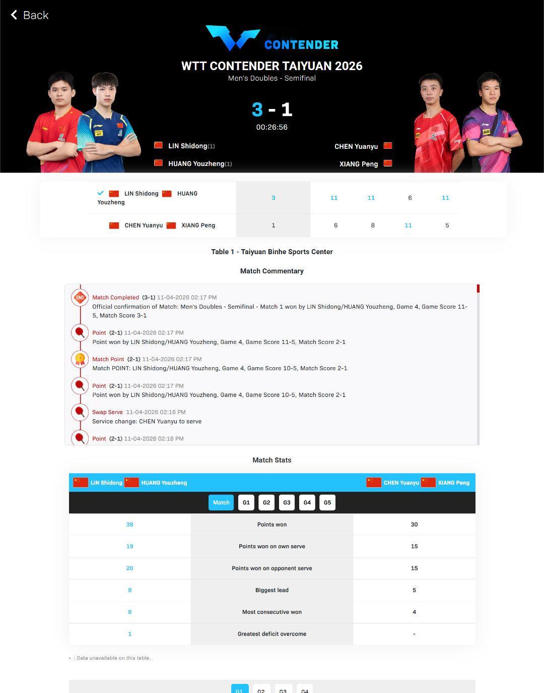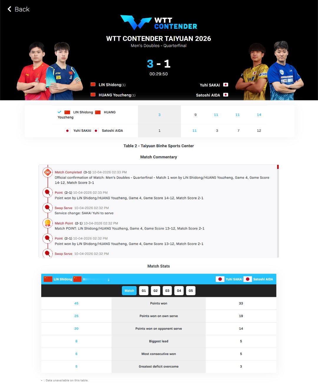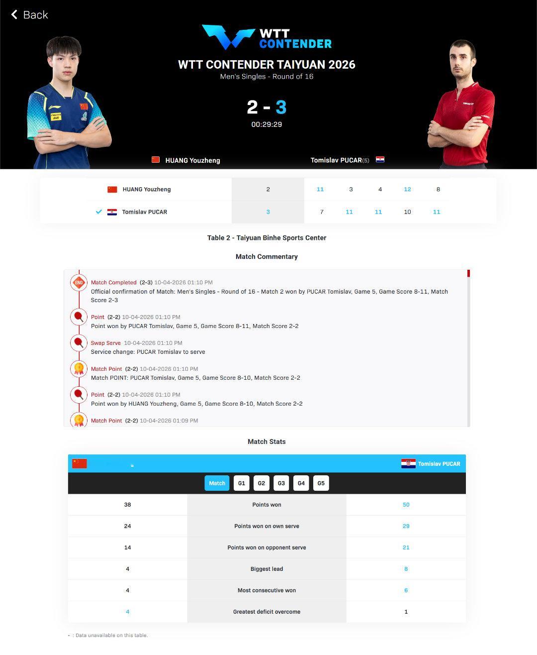 🏓04.10『正赛第二比赛日』📎混合双打1/4决赛黄友政/石洵瑶🇨🇳3-2姚钧涛/吴咏琳🇭🇰📎男子单打1/8决赛黄友政🇨🇳2-3托米斯拉夫·普卡🇭🇷📎男子双打1/4决赛黄友政/林诗栋🇨🇳3-1英田理志/坂井雄飞🇯🇵📎混合双打半决赛黄友政/石洵瑶🇨🇳3-1坂井雄飞/高森爱央🇯🇵