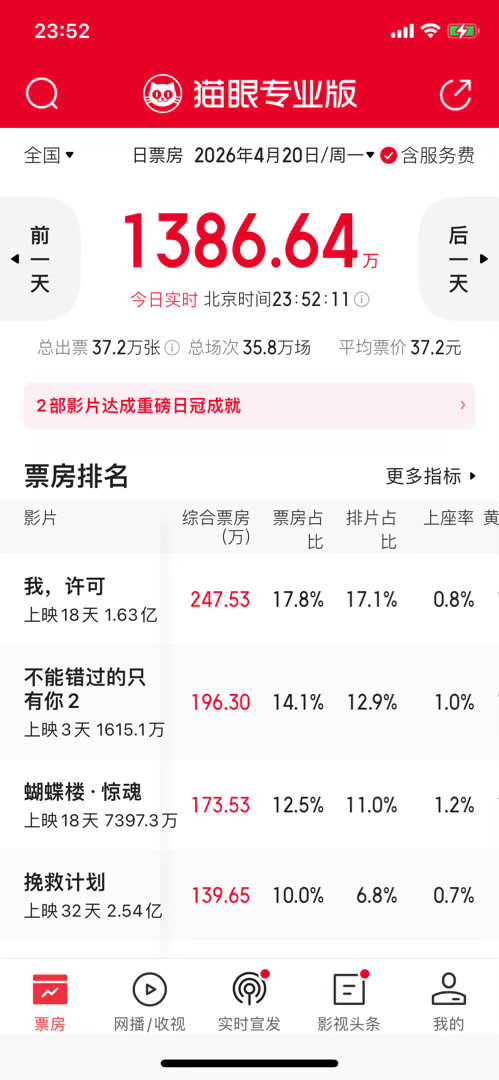 今天周一,单日票房1380多万,不及除夕夜的1400万票房,是今年以来票房最低的