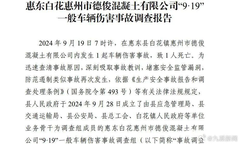 #官方通报洒水车溜坡司机遭碾压致死#【#洒水车溜坡碾压驾驶员致死亡调查报告#】近日,广东惠州市惠东县应急管理局发布《惠东白花惠州市德俊混凝土有限公司“9·19”一般车辆伤害事故调查报告》,明确这起场内洒水车溜坡致人死亡事件,是一起因驾驶员违规操作、企业安全生产主体责任落实不到位引发的一般生产安全责任事故,涉事作业车辆经查实为套牌车。