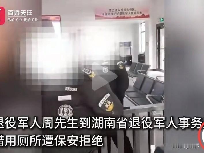 一位右腿受伤、拄着拐杖的退役老兵,内急想进退役军人事务厅上厕所。工作人员都同意了,偏偏一个保安死活拦着不让进,说“周五下午不营业”。
