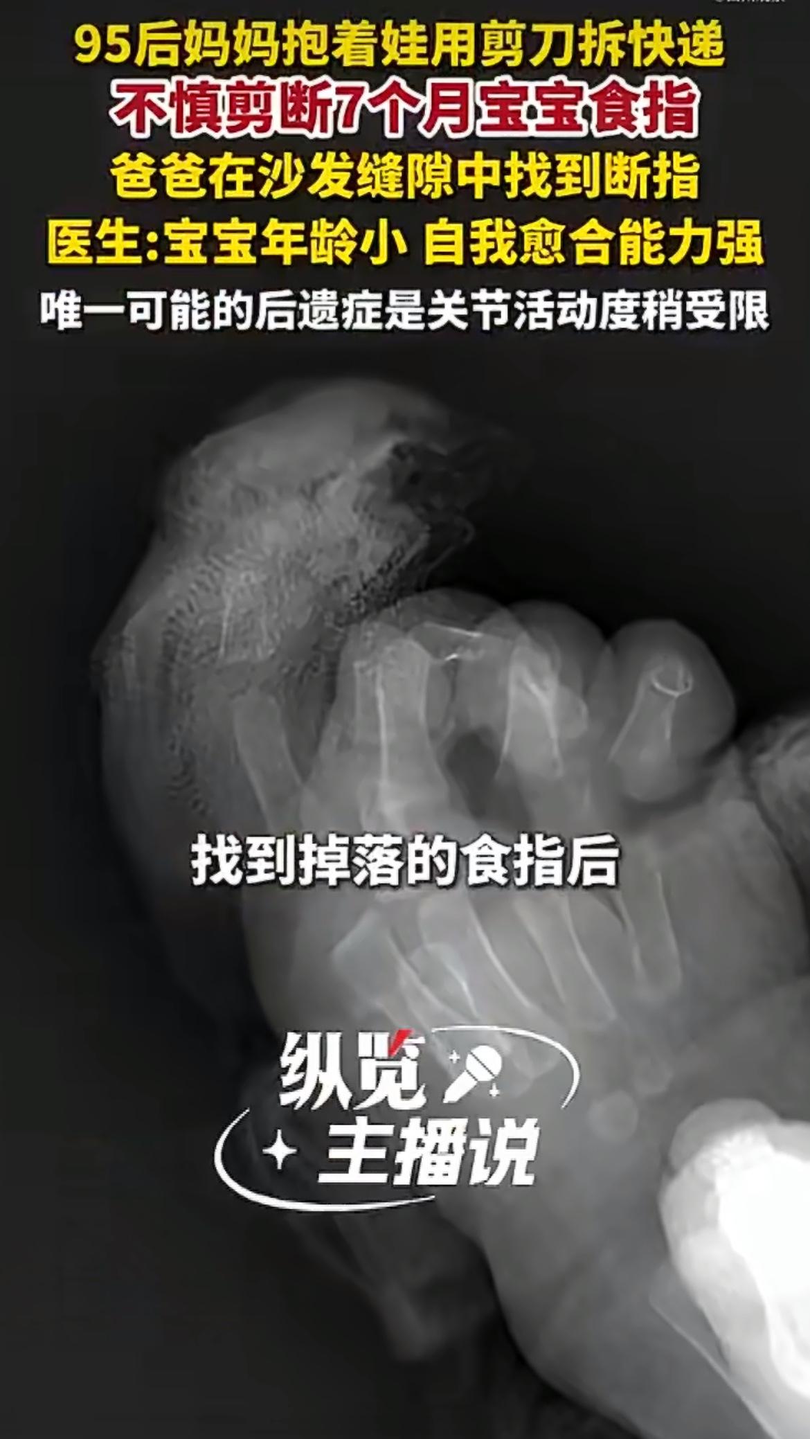 家住济南的芙芙妈妈抱着才7个月大的女儿拆快递,她右手抱着孩子,左手拎着快递,右手还握着剪刀拆封,本来以为已经按住了孩子的手,没想到孩子动得太快,一剪子下去,直接把芙芙右手食指的第一关节完全剪断了。
