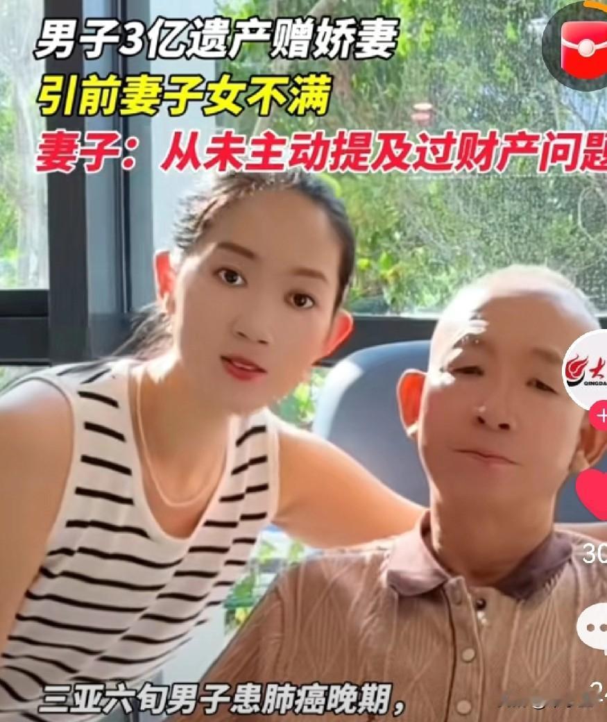 海南三亚一男子癌症晚期三亿元赠小他28岁第二任妻子,前妻2个孩子一分不给,网友说:这男的也是个情圣,活宝,自己还有俩个亲生儿女一分都不留,太不正常了,目前孩子己起诉,还没有判决结果丈夫患癌晚期 患癌男子