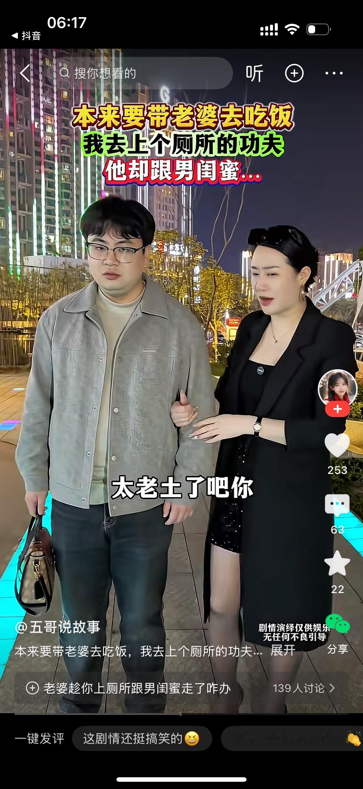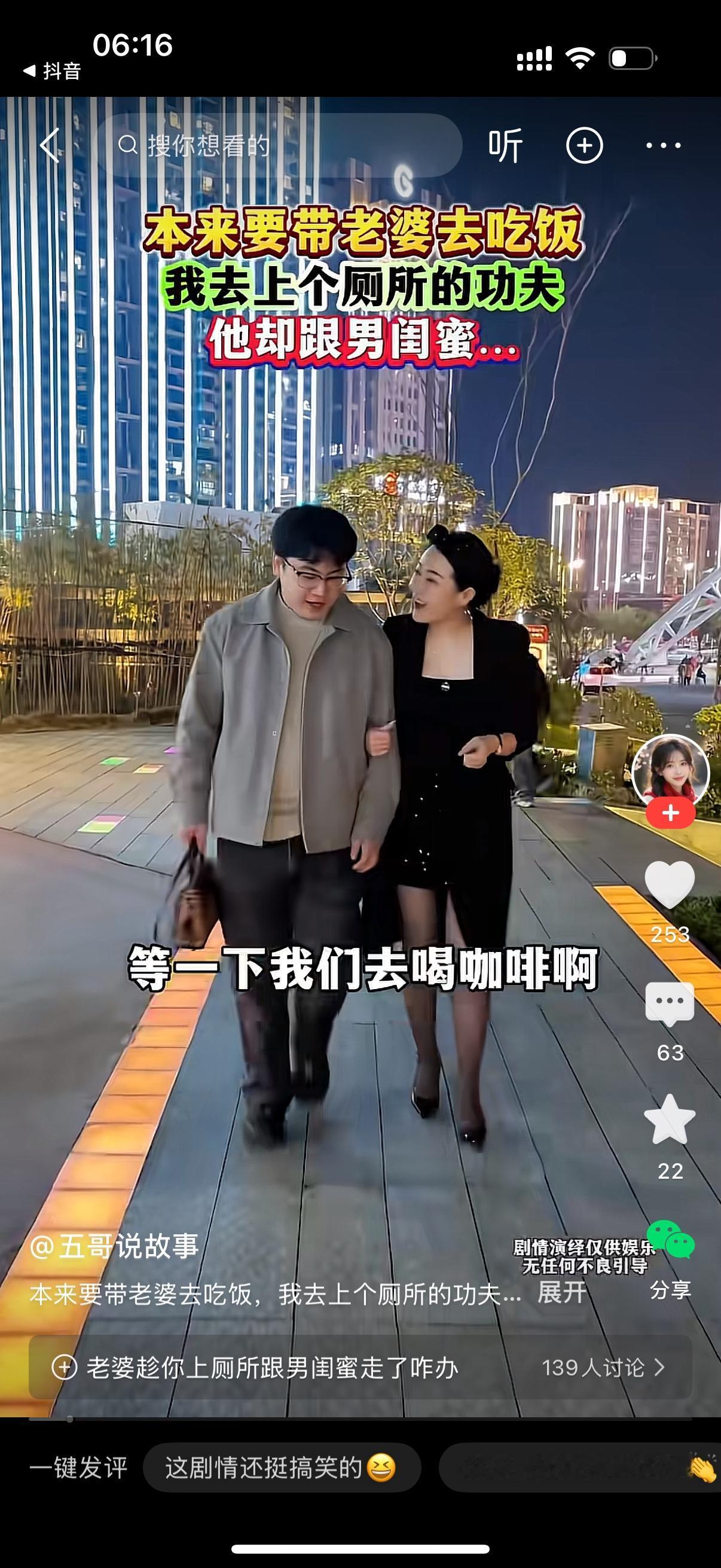 丈夫本来要带老婆去吃饭,上个厕所的功夫发现妻子和一个男人手牵着手走在路上。丈夫跑