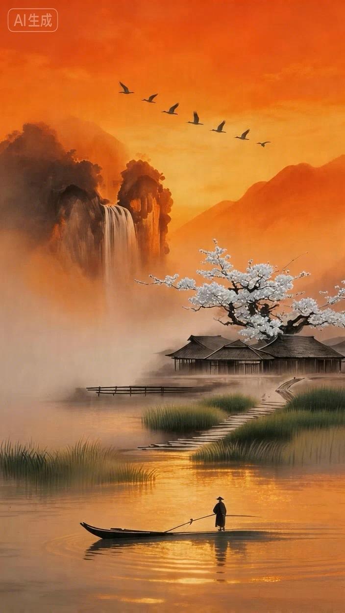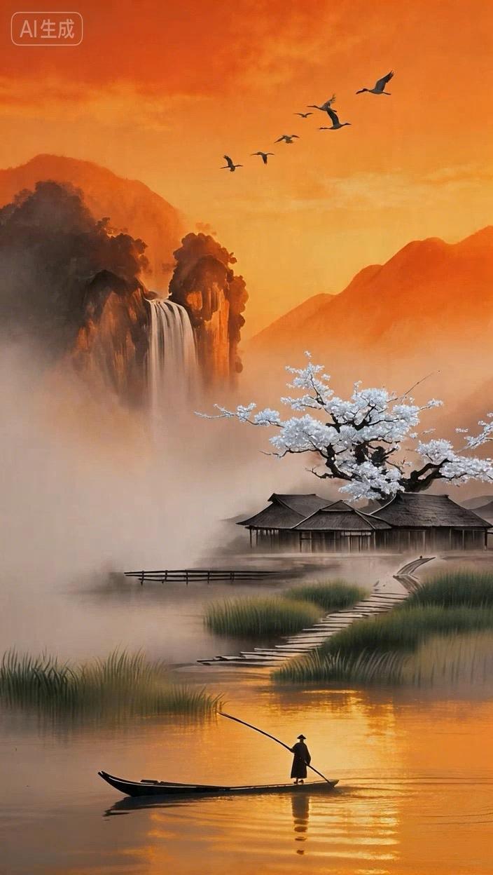 大雁群飞瀑布雄,