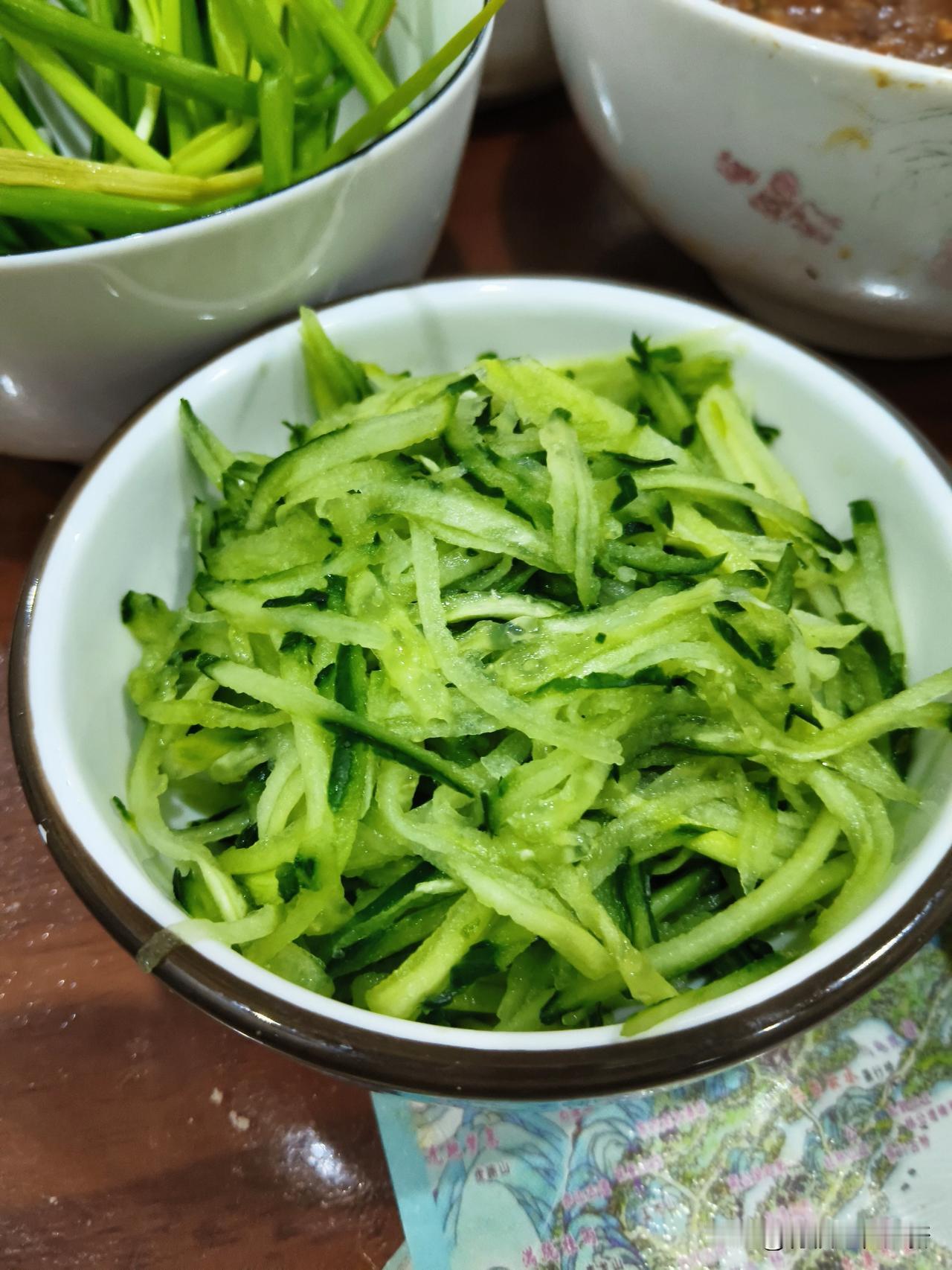 黄瓜丝儿,香椿芽,小葱,凉面条,炸酱,调在一起。