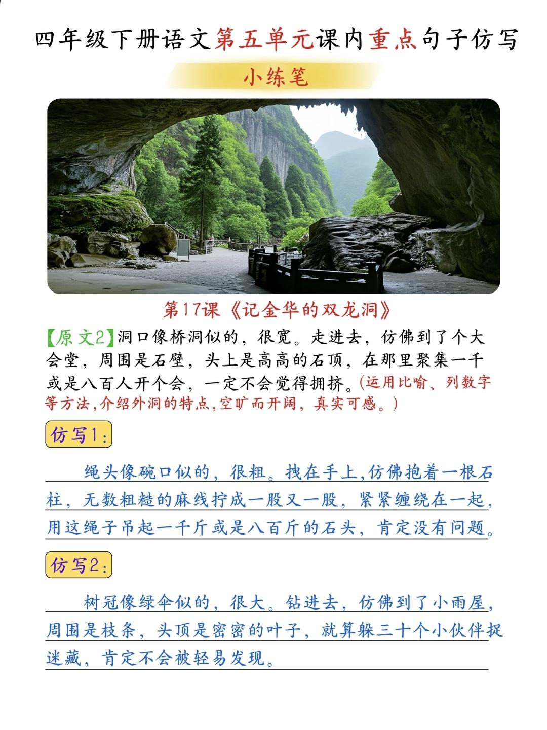 四年级下册语文,第五单元第17课《记金华的双龙洞》课文重点句子仿写,收藏参考学习~四年级语文 仿写小练笔