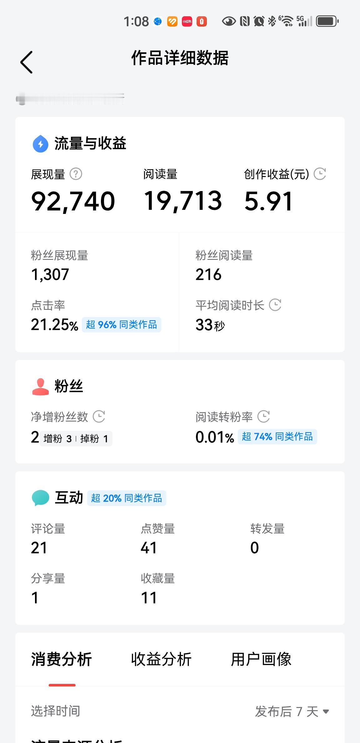 最近一个星期先后发表三篇同一体育类微头条,字数差不多,得到的阅读量不尽相同,有一篇3万多,二篇1万多的,但收益天壤之别,两篇1.9万多阅读量的有一个8元多,一个5元多,阅读量3万多的那篇却只有0.8元。