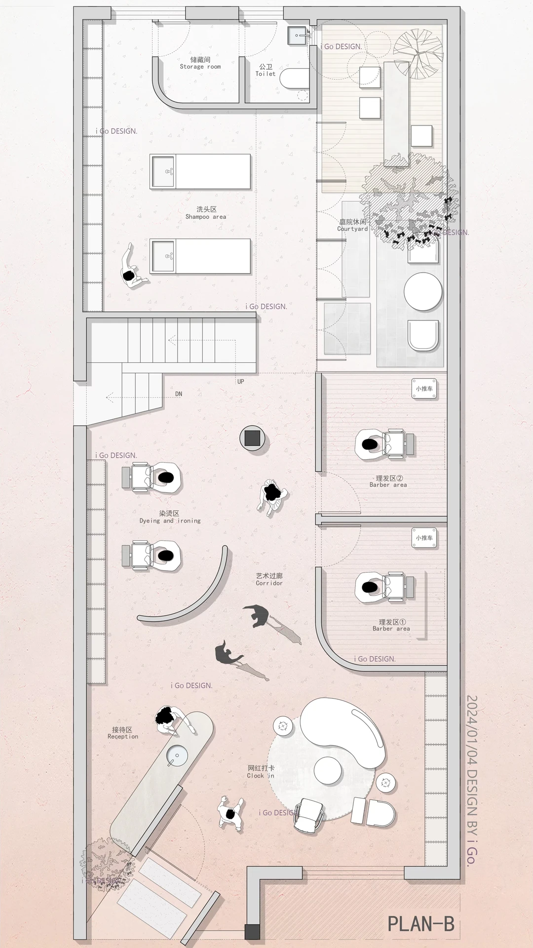 服务动线:染烫 + 洗头区相邻,提升服务效率;