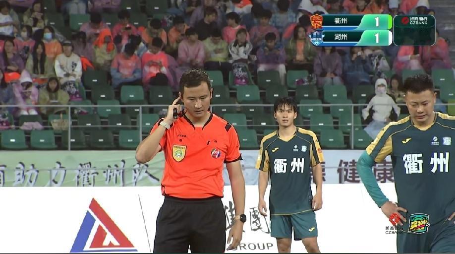 湖州队下半场一开场就将比分扳平,现在场上比分是1:1。当主裁判和场外在讨论这个进球是否越位的时候,小编的小心脏都是突突的……