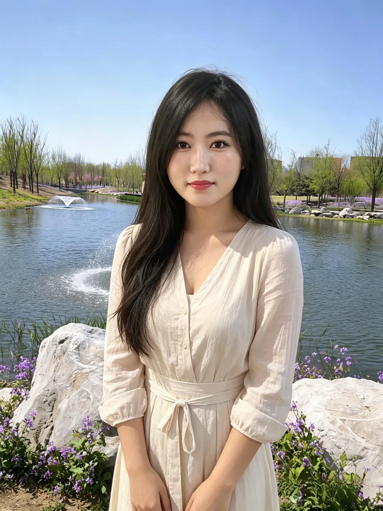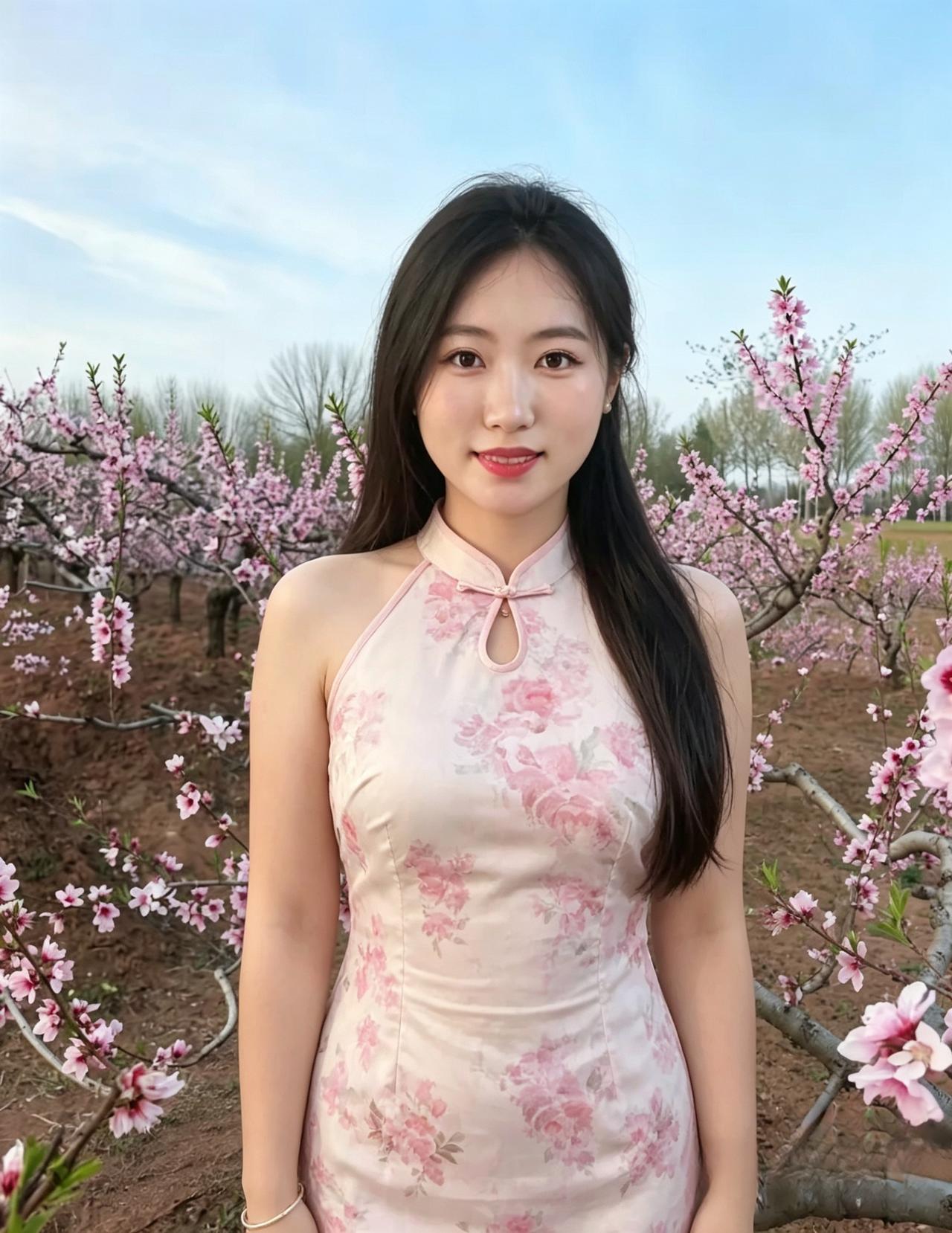 粉桃千树映春妆, 玉颈清裁旗袍香。 浅笑嫣然风亦醉, 人间春色满芬芳。