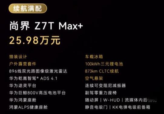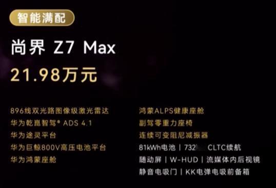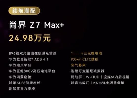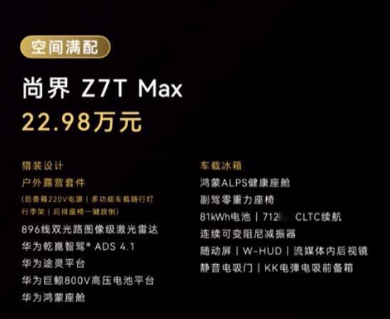 896线激光雷达/ADS4.1/鸿蒙座舱/随动屏/流媒体后视镜/电吸门/电前备箱/后备箱220v电源/车载随行灯/行李架