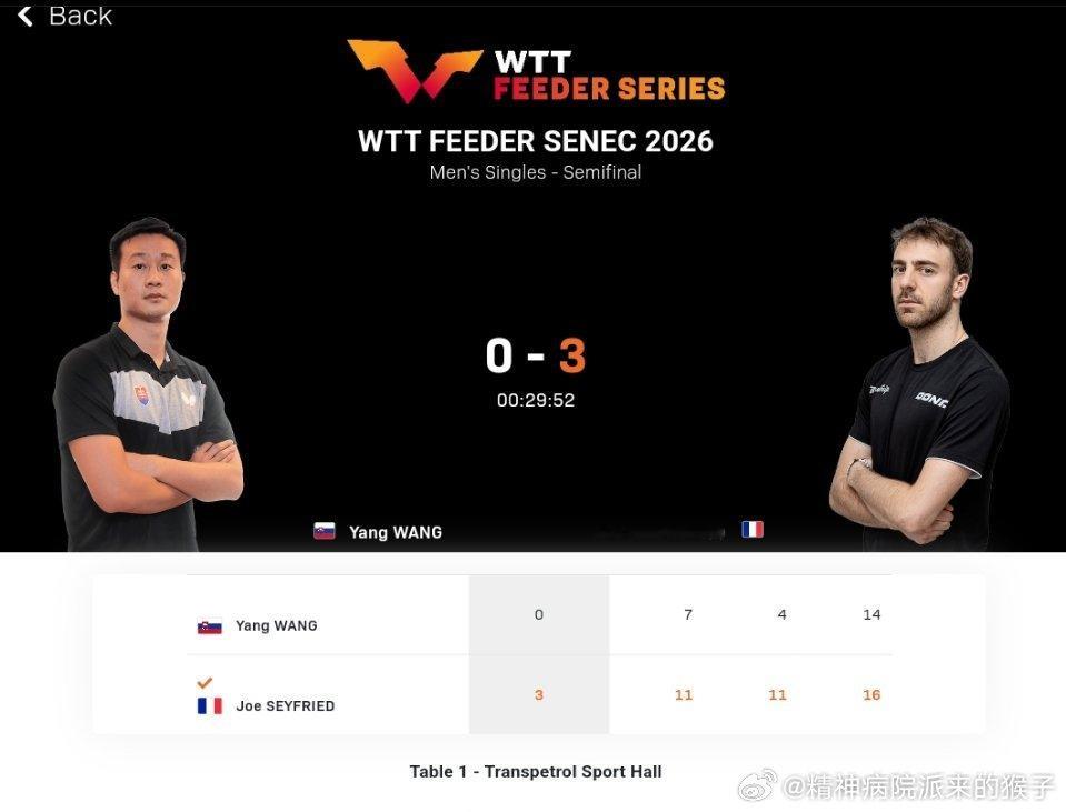 塞弗里德3比0汪洋(7,4,14)奥耶博德3比1皮斯特耶(11,4,-4,4)晋级2026WTT塞内茨支线赛男单决赛决赛:塞弗里德🇫🇷VS奥耶博德🇮🇹