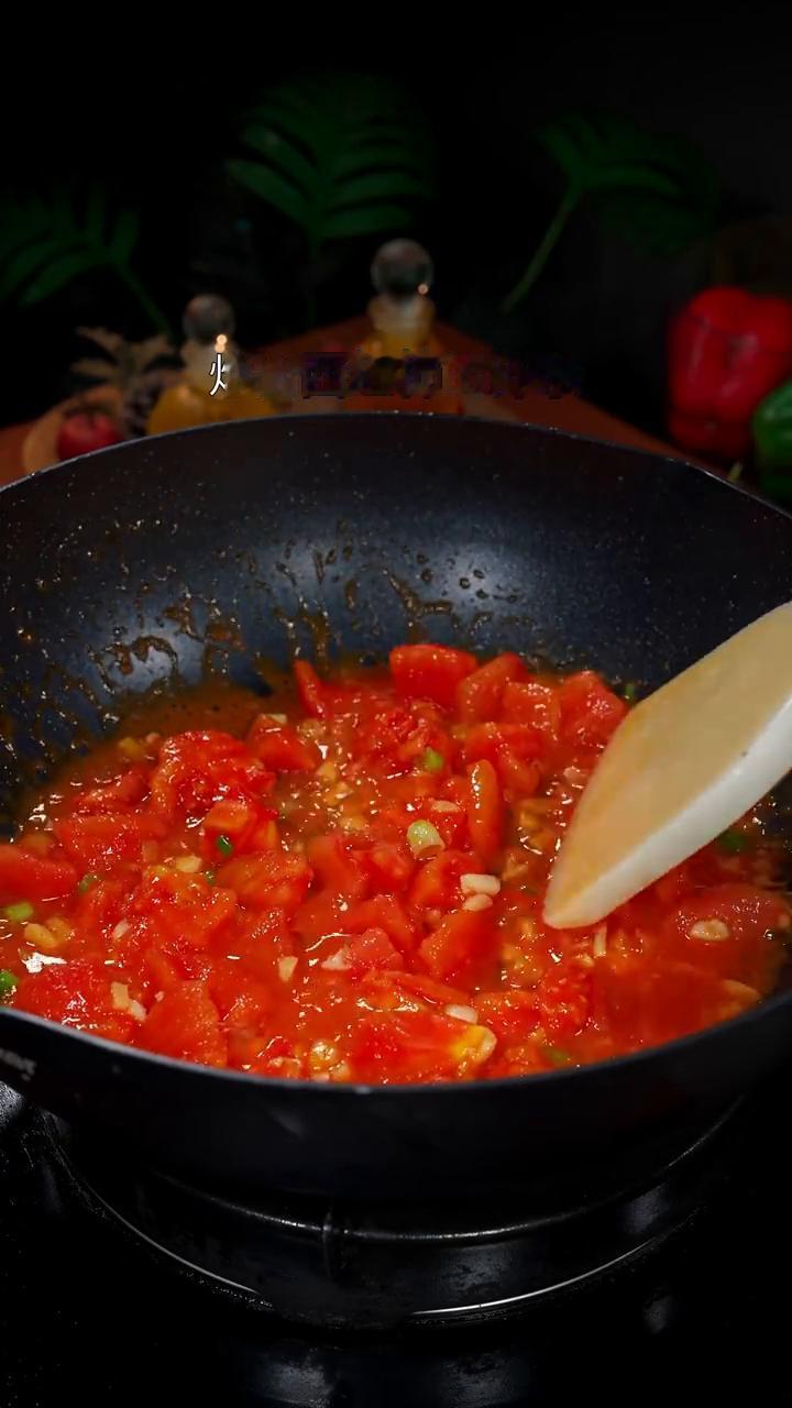 ·接着把葱、姜、蒜爆香,放入切好的西红柿,加一勺盐多炒一会,炒出西红柿的汁水。