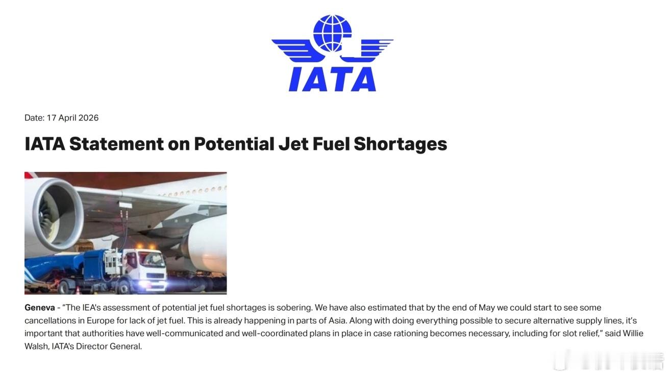 4月17日,IATA(国际航空运输协会)在其官网发布了关于潜在航空燃油短缺的声明。此前,包括国际能源署(IEA)在内的多个机构都曾警告:由于美以伊冲突导致霍尔木兹海峡航运受阻,全球能源供应链遭受严重冲击,航空燃油供应面临严峻风险。
