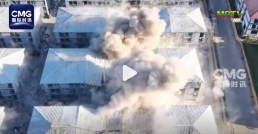 缅甸广播电视台播出的画面显示,位于克伦邦妙瓦底地区的KK电诈园区建筑物通过爆破和挖掘机被拆除。