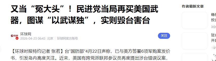 信息来源:《又当“冤大头”!民进党当局再买美国武器,图谋“以武谋独”,实则毁台害台》,环球网,2026年4月13日。