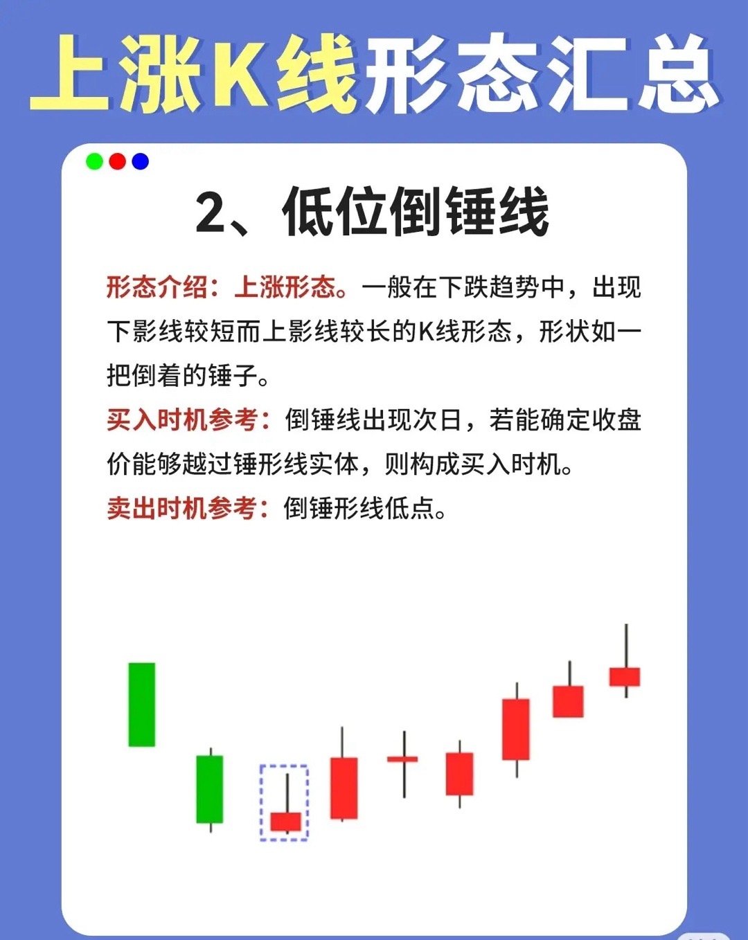 买入时机参考:倒锤线出现次日,若收盘价能够越过倒锤线的实体(验证多头力量持续),则构成买入时机。