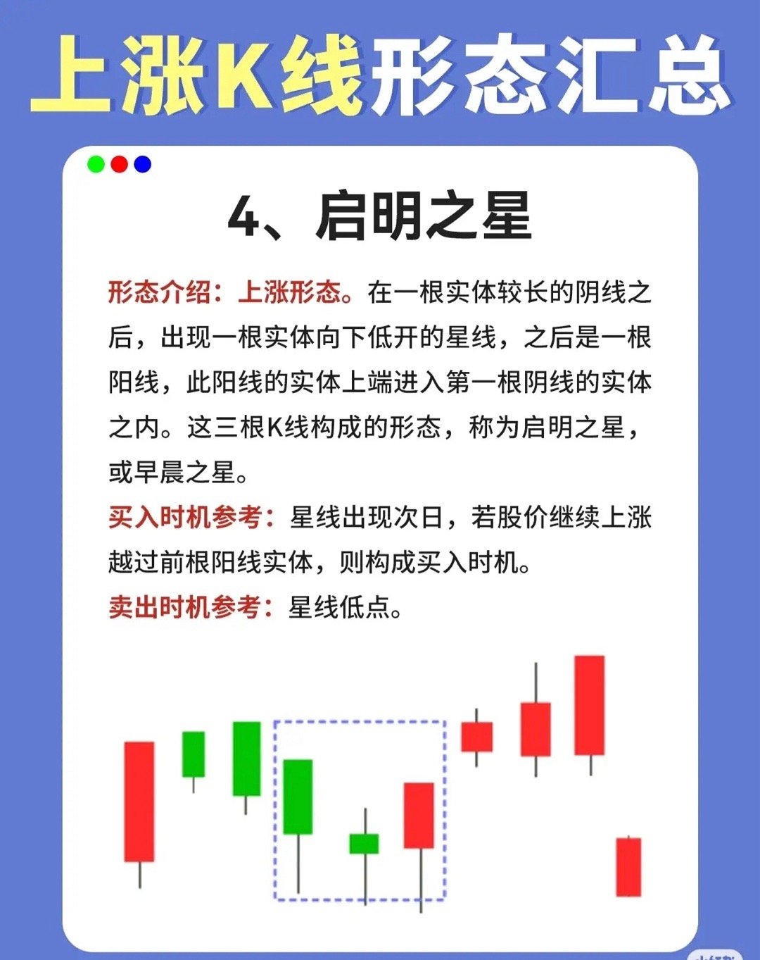形态介绍:经典的上涨反转形态,由三根K线组成:第一根为实体较长的阴线(延续下跌趋势),第二根为向下低开的星线(多空短暂平衡),第三根为阳线且其实体上端进入第一根阴线的实体之内(多头强势反攻)。