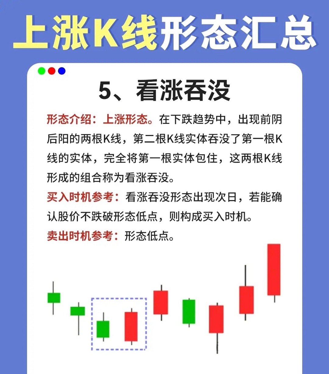 形态介绍:上涨反转形态,出现在下跌趋势中。由两根K线组成,第一根为阴线,第二根为阳线且其实体完全吞没第一根阴线的实体(表明多头力量彻底压倒空头)。