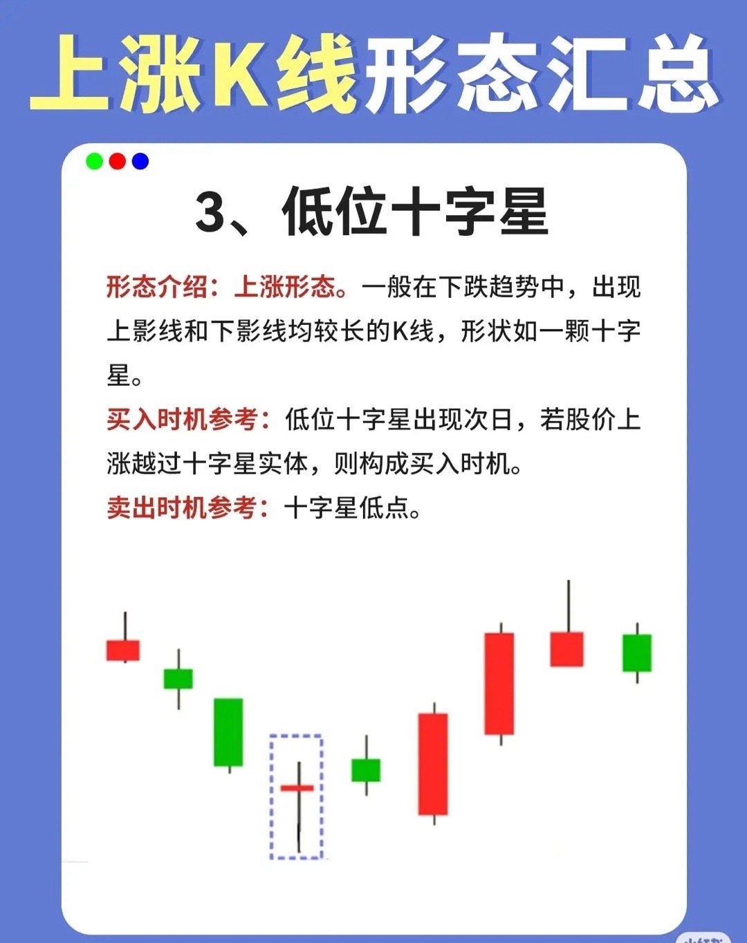 买入时机参考:低位十字星出现次日,若股价上涨并越过十字星的实体(表明多头占据主动),则构成买入时机。
