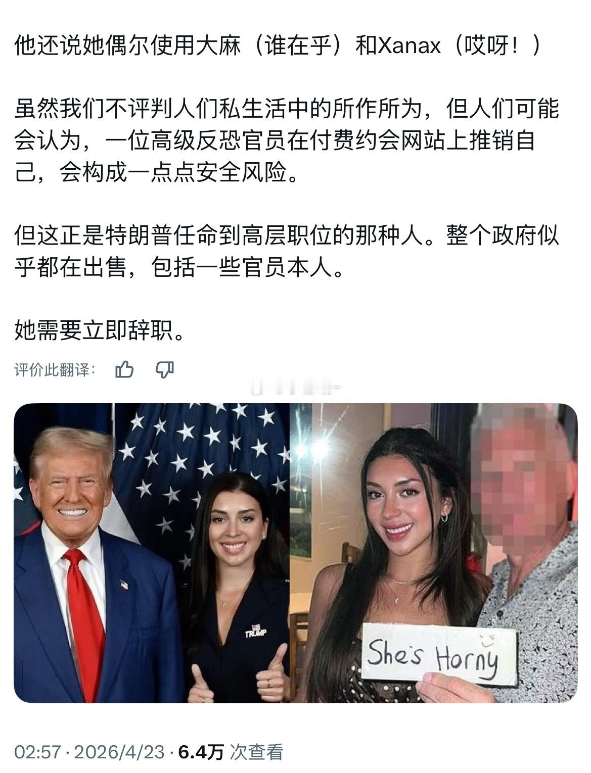 据称,这名男子提醒她,这种关系可能危及她所持有的最高机密安全许可时,她回应说,自己“高贵到不用接受审查”。