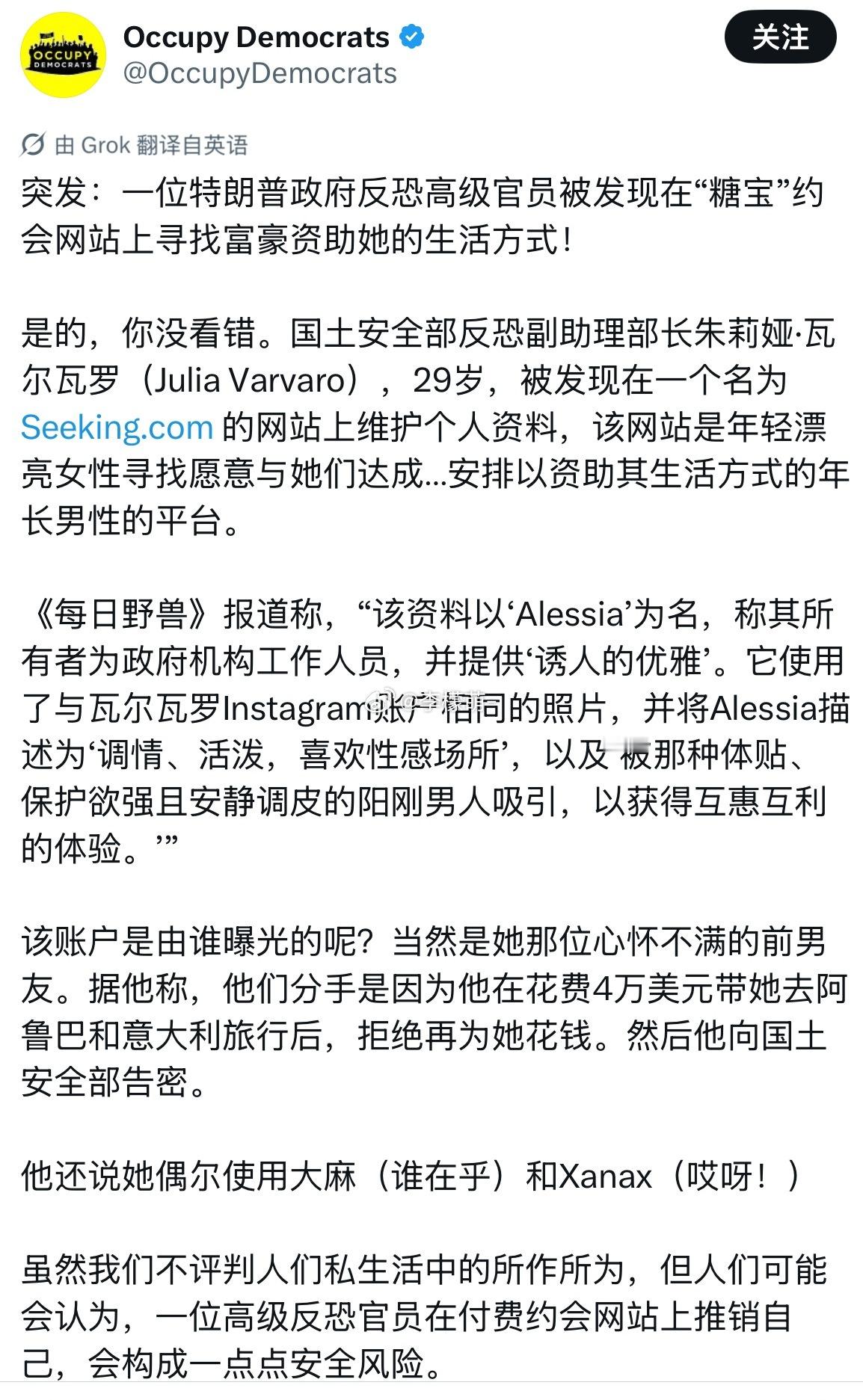 美国国土安全部反恐官员朱莉娅·瓦尔瓦罗因“糖爹”投诉而被调查