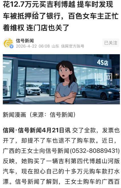 广西百色,女子花12.7万元在4S店买吉利博越,却在提车时,得到了一个晴天霹雳的消息:车早就抵押给了银行,没法交车,也不能退给她一分钱了。接下来,女子一直走在维权的路上,想拿回自己的血汗钱。结果,发现4S 店关门大吉,跑路了,这下女子彻底傻眼了!