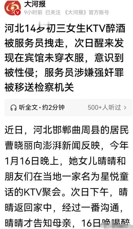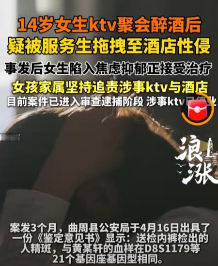 必须严惩!河北曲周,一14岁初中女生,跟朋友在KTV聚会时醉酒,醒后发现自己躺在陌生宾馆的床上,身上没穿衣服。第二天下午,在母亲反复追问下,她才说出实情:当晚,她被KTV一个男服务员带走,在宾馆前台,这名服务员登记后,将她拖至房间,她不认识对方,母亲立即报警。