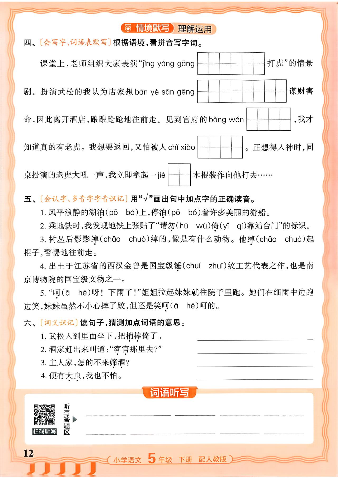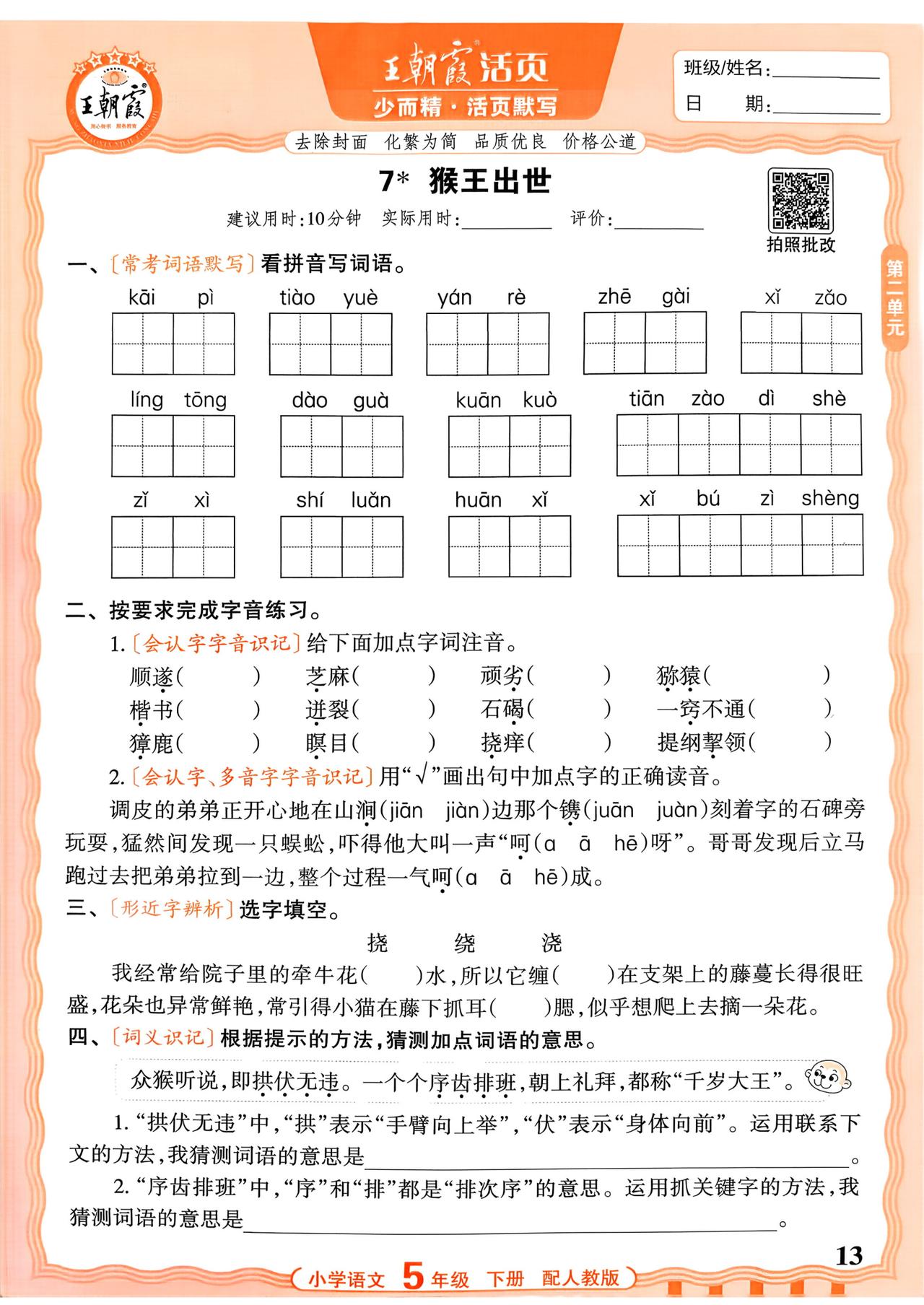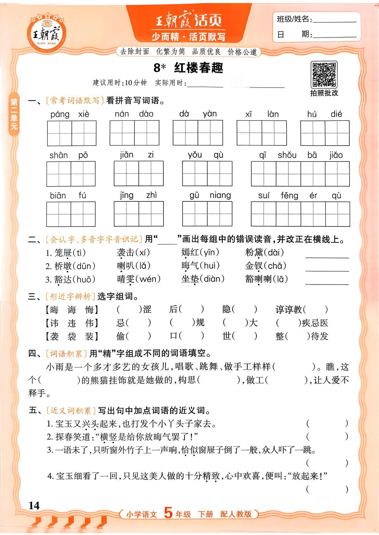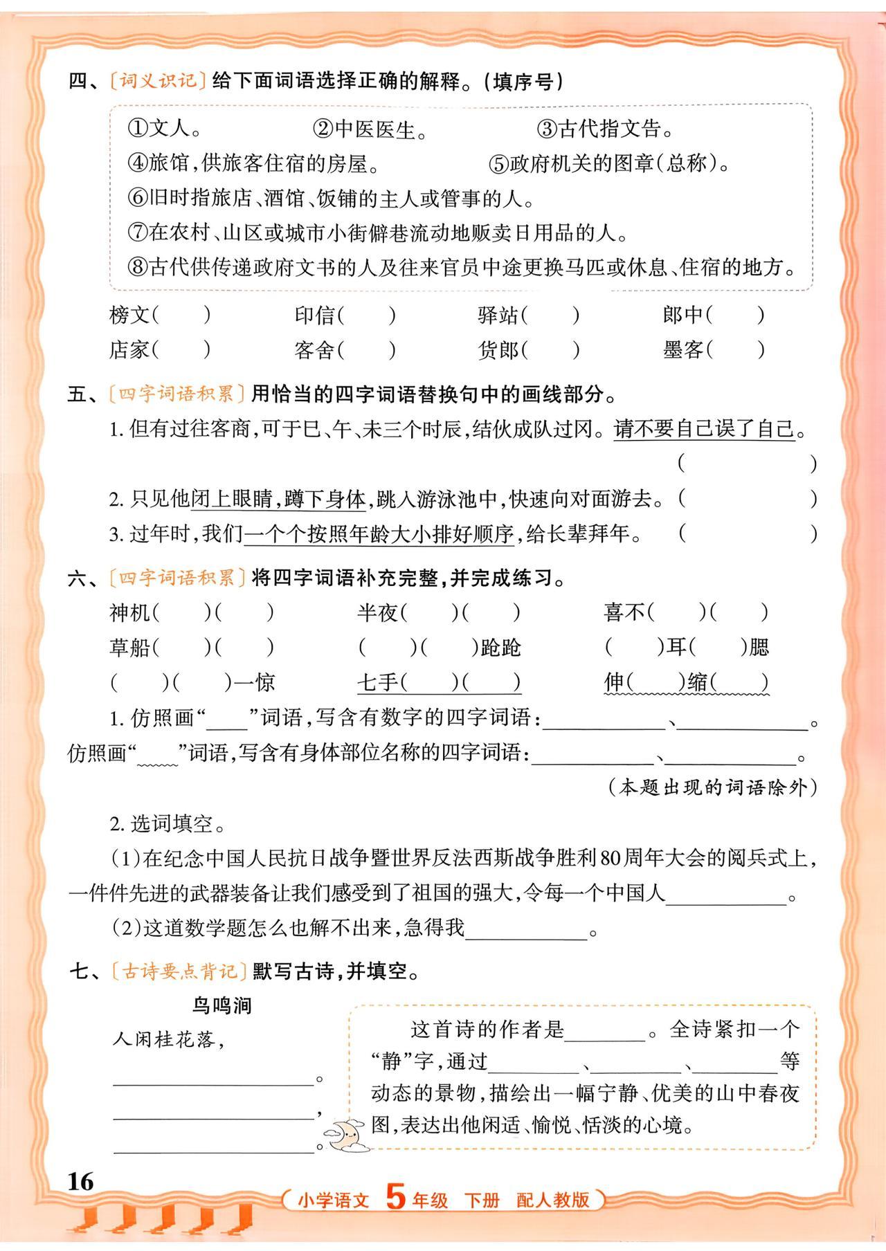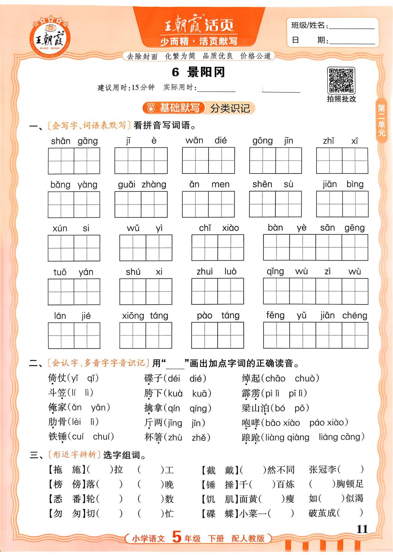 26春五年级下册语文,第二单元基础知识《活页默写》+参考答案,收藏备用