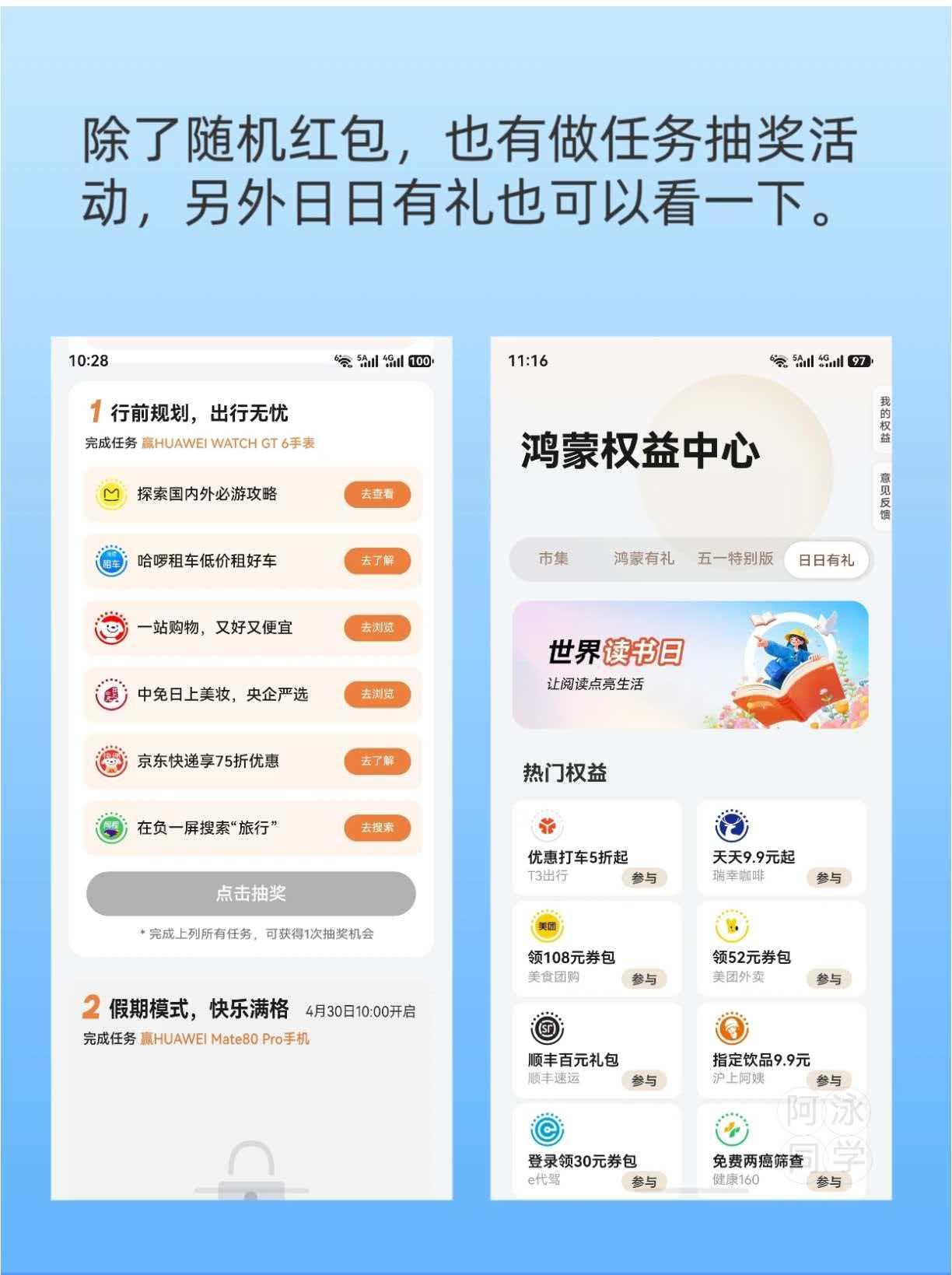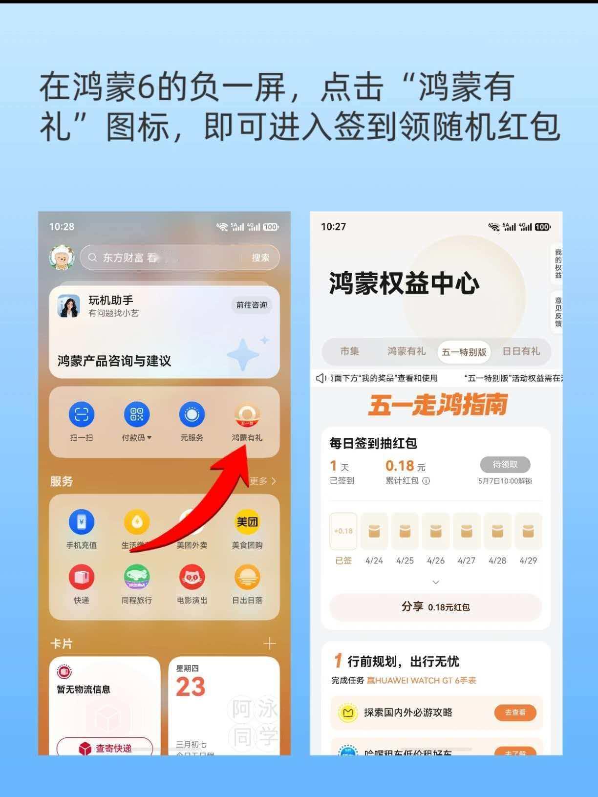 今天23日首日推出,从负一屏可以进入,点击鸿蒙有礼,五一特别版可以进行签到,最多可签到14天。从23日—5月6日。签到有随机红包可以领取,第一天签到0.18,虽然可能不多,但送的红包不要白不要。