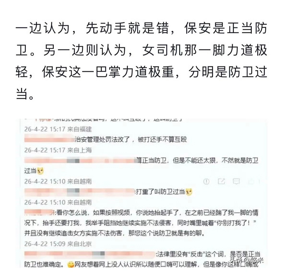 “女子先动的手,所以错在先!保安是正当防卫!”“女子是先动了手,可保安这一巴掌太