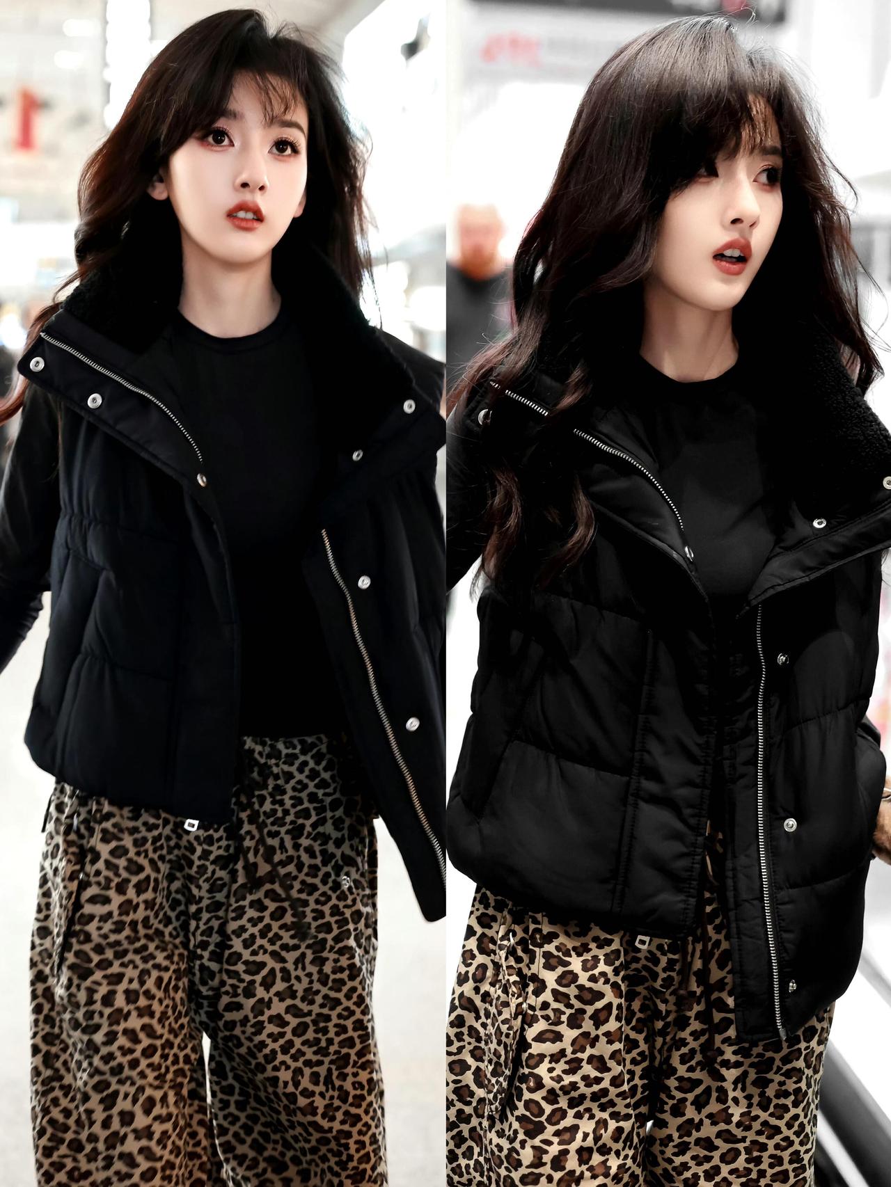 黑色马甲搭配紧身黑打底,又酷又保暖,豹纹阔腿裤直接把复古氛围拉满,高腰设计衬得腿又长又直,脚下的帆布鞋又添了几分随性街头感。蓬松卷发搭配利落黑调,中和了豹纹的张扬,又甜又野的港式辣妹风被她轻松拿捏,时髦度和辨识度直接拉满。
