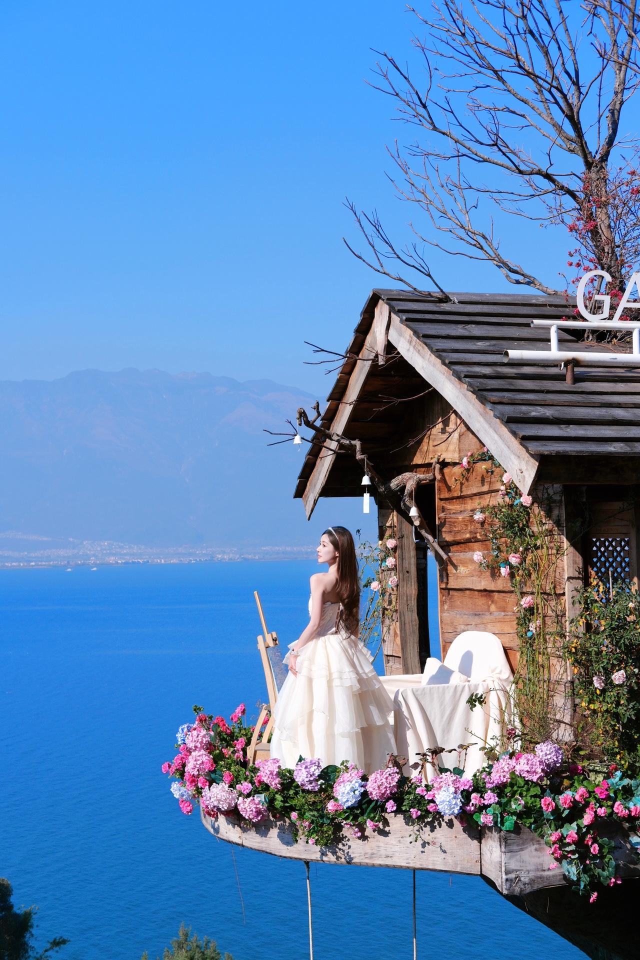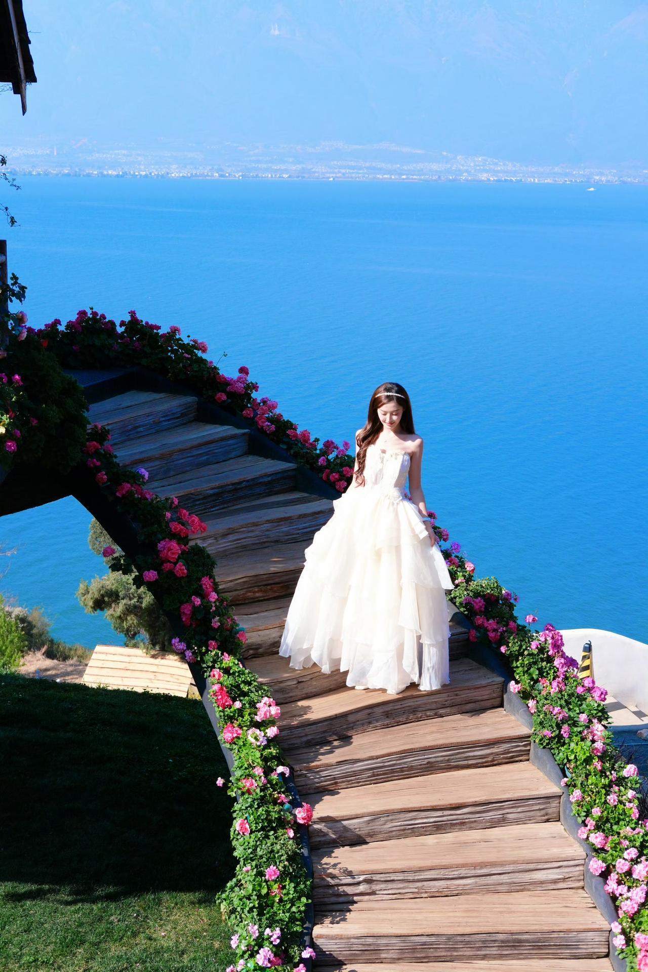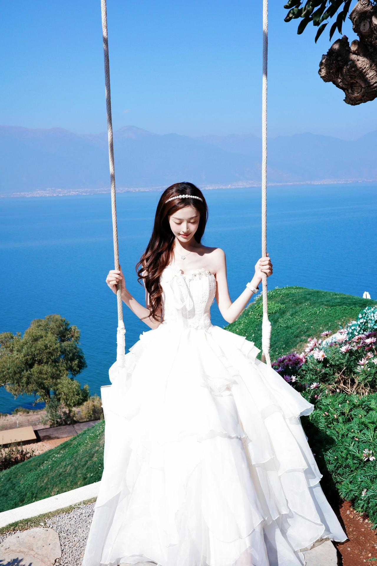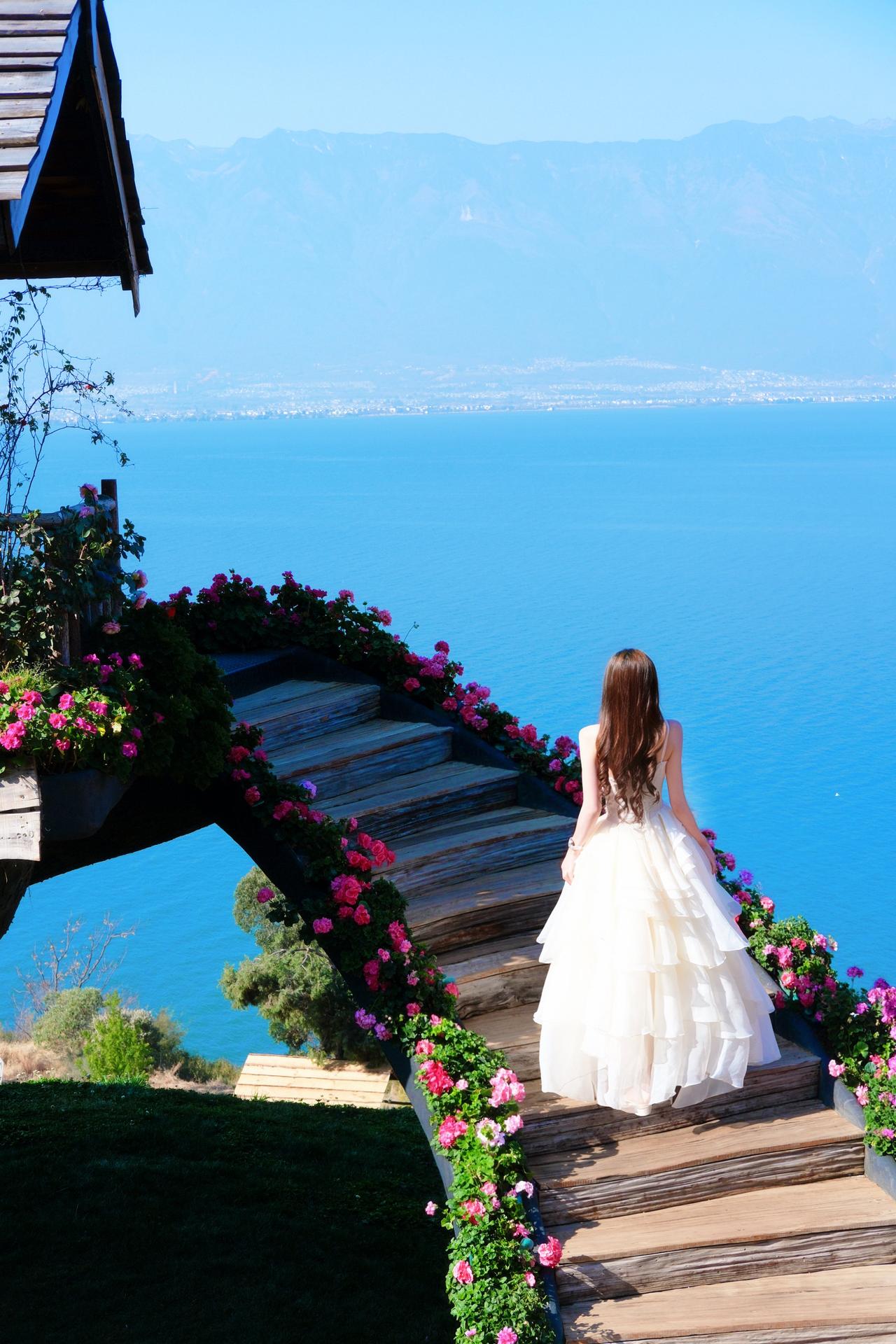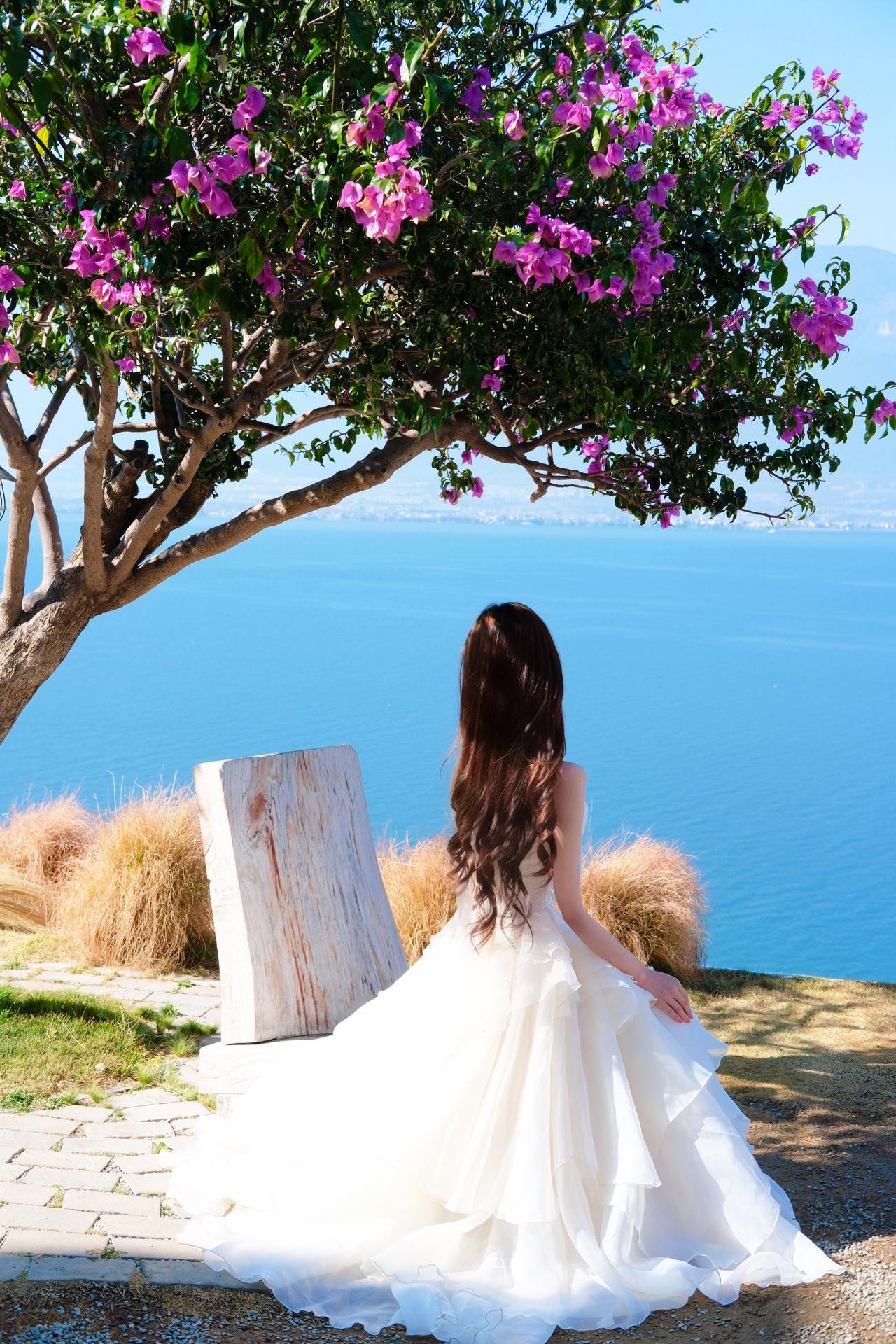 蓝天为幕,碧海为台,繁花簇拥着一袭白裙。