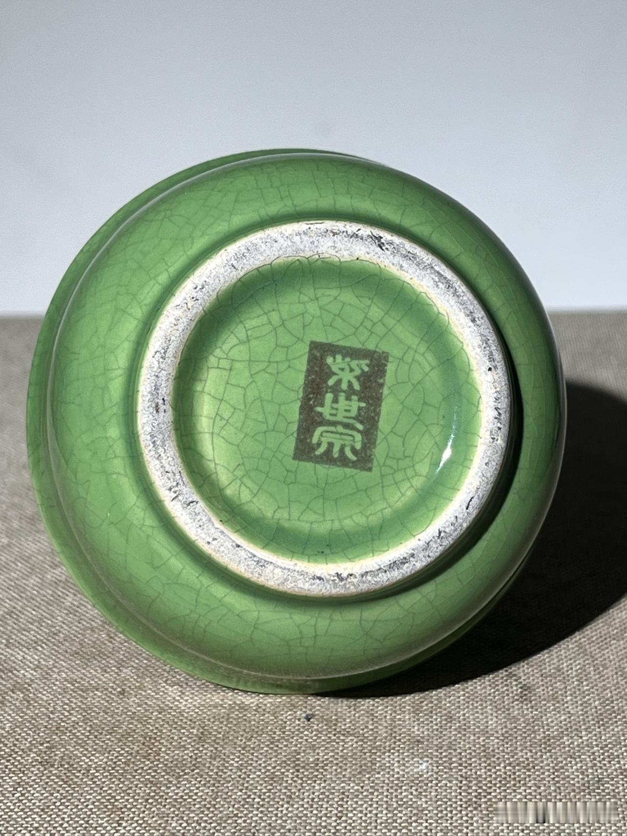 瓶底留存柴世宗方形篆书官款,字体规整古拙,是五代后周世宗柴荣御窑的标志性落款。整器修足规整,胎釉衔接干净利落,传世包浆温润自然,从釉色开片、器型制式到底部官款,全器皆合柴窑古制,尽显五代御窑官窑的极简高雅气韵。