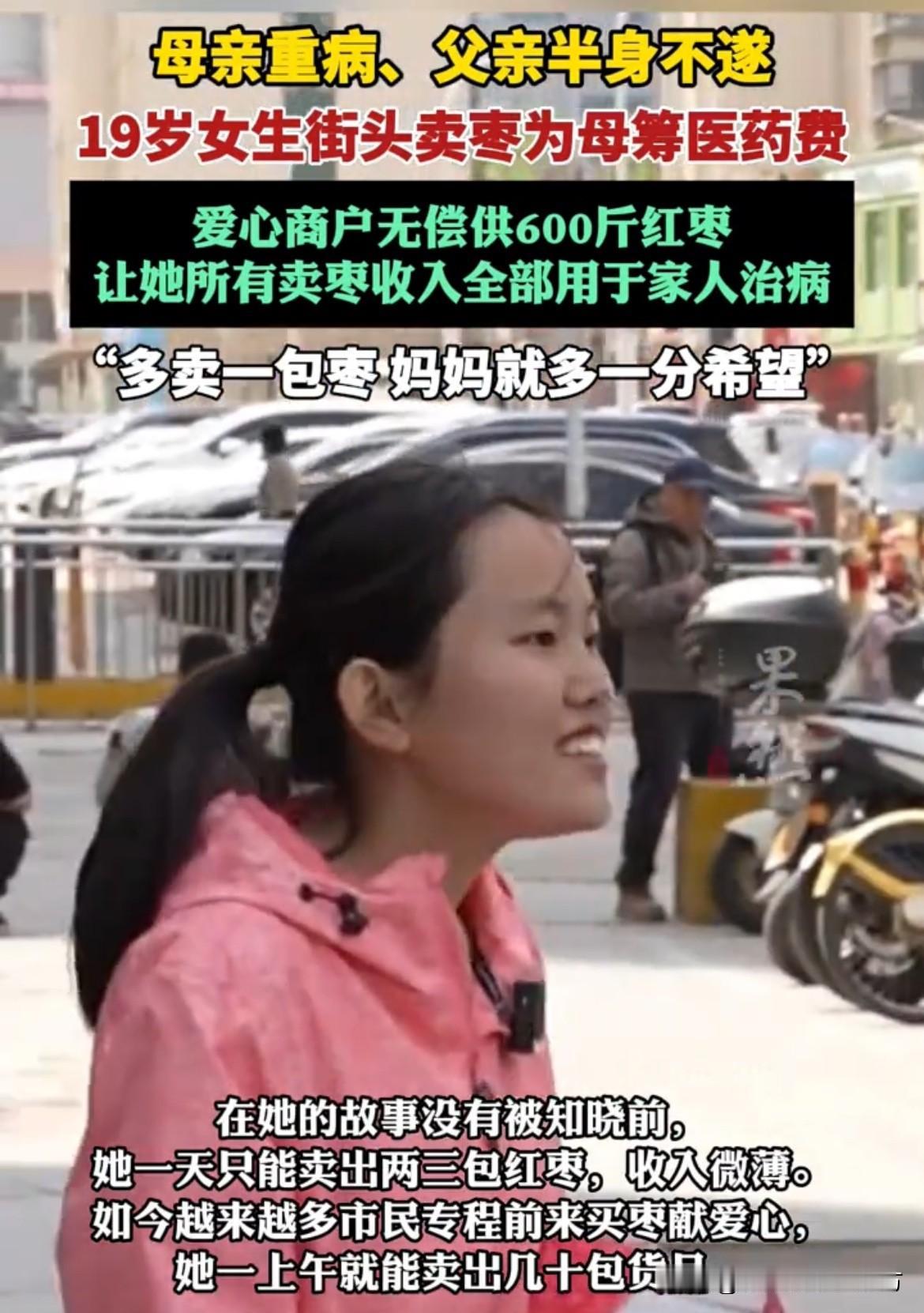 她心里只有一个念头:多卖一包枣,妈妈就多一分活下去的希望,再苦再累,只要能治好父母的病她都愿意扛。