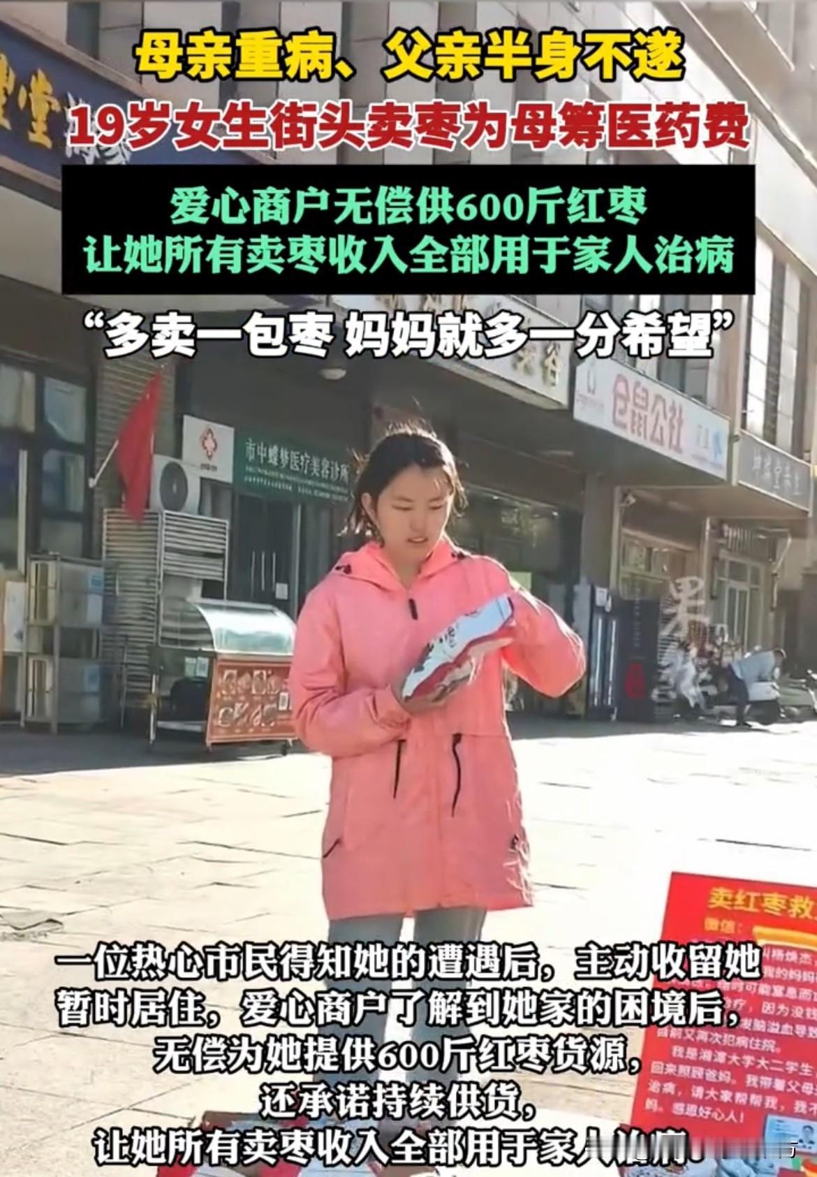 “孩子,你太不容易了,这些枣阿姨免费给你,你安心卖,所有收入都留着给爸妈看病,阿姨能帮一点是一点!”商家的这番话,让杨焕杰瞬间红了眼眶,长久以来的委屈和艰难,在这一刻化作泪水,她不停地向好心商家道谢,这份突如其来的善意,让她在绝望中看到了希望。