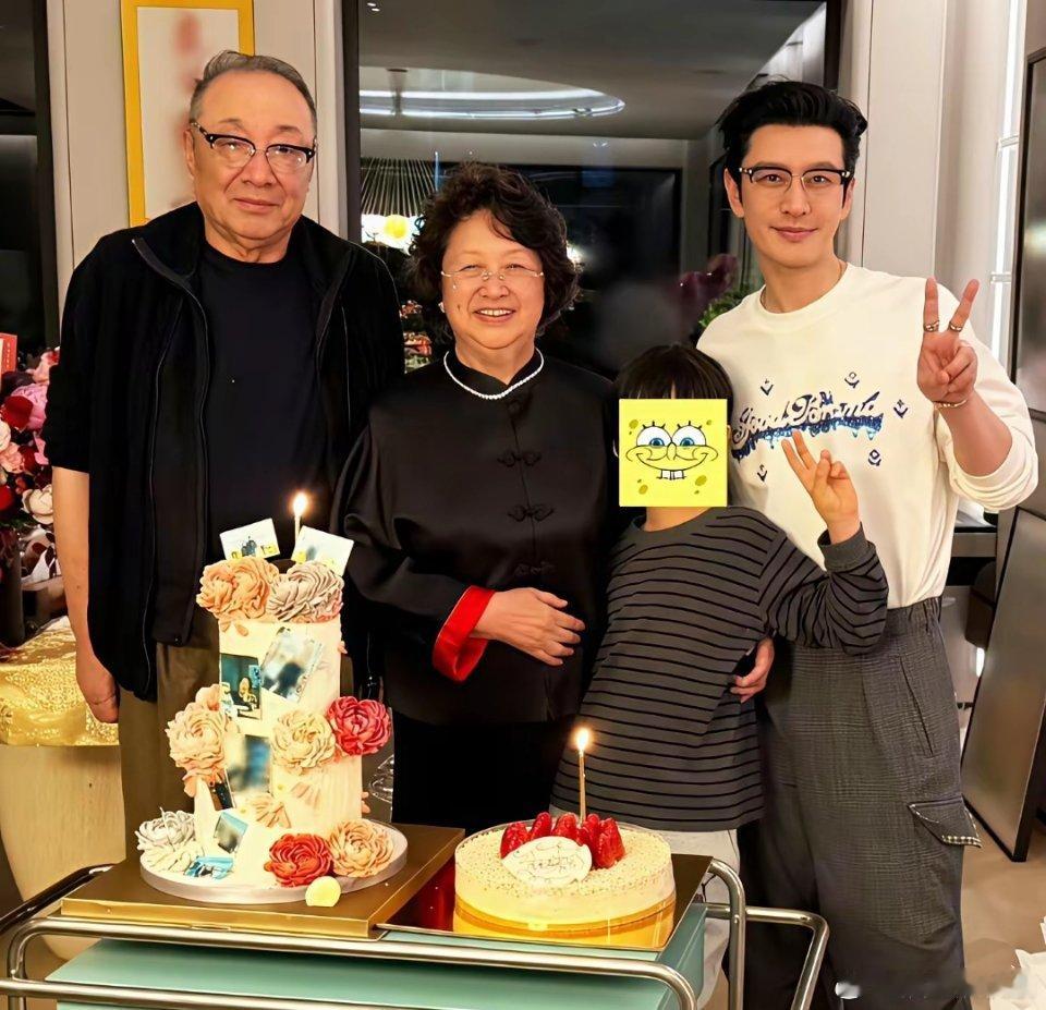 黄晓明一家四口在上海团聚,9岁儿子小海绵回到爸爸家里,一起为奶奶庆祝74岁生日。