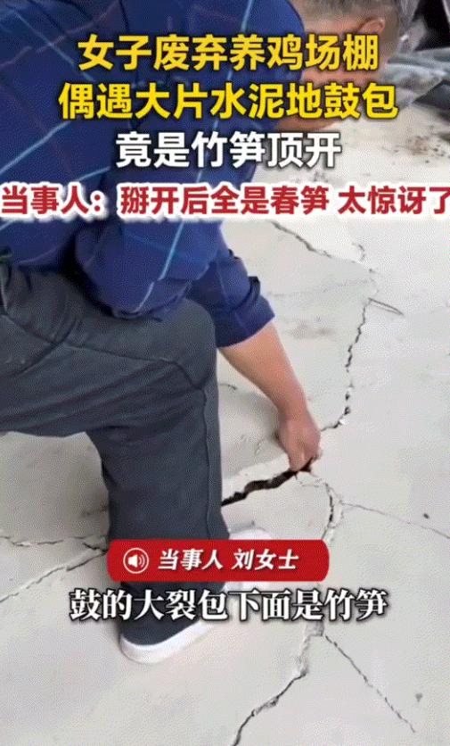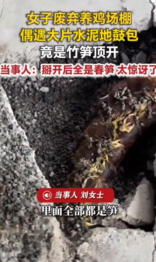从刘女士拍的视频里能清楚看到,鸡棚的水泥地面上,已经裂开了不少缝隙,一根根竹笋从裂缝里冒了出来,横七竖八地站着,有的长得笔直像是在努力向上伸展,有的微微弯曲,像是刚从地底钻出来还没站稳,远远看去就像一群刚从地底冒出来的小士兵,充满了生机。