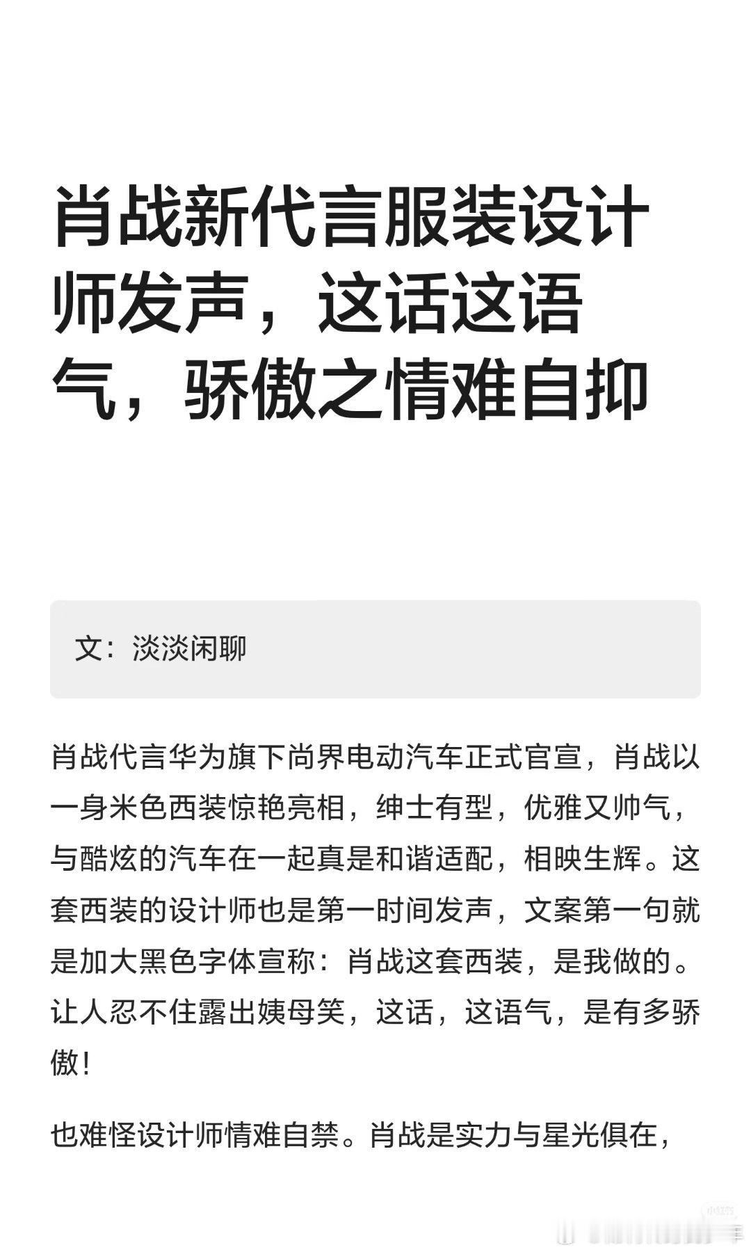 肖战新代言服装设计师发声: 肖战这套西装是我做的!这话这语气好骄傲肖战就是别人最