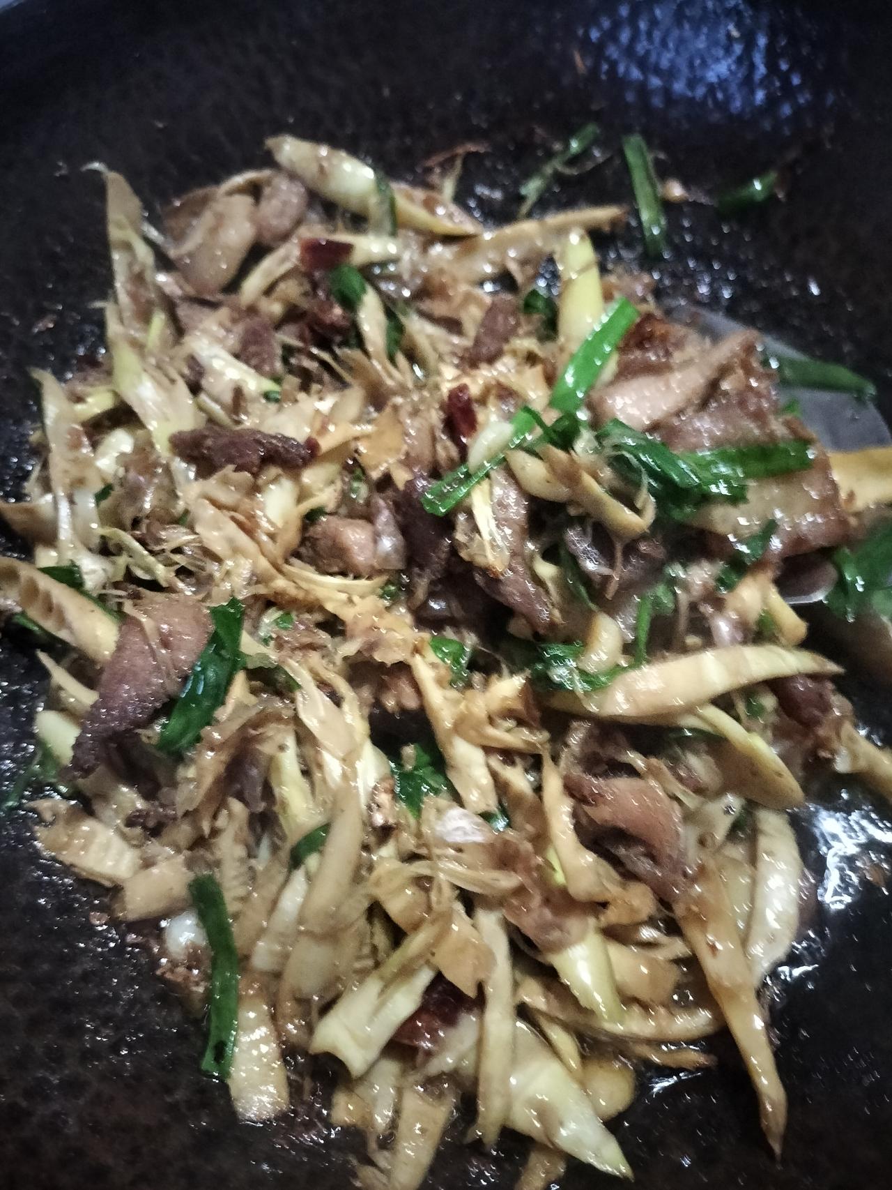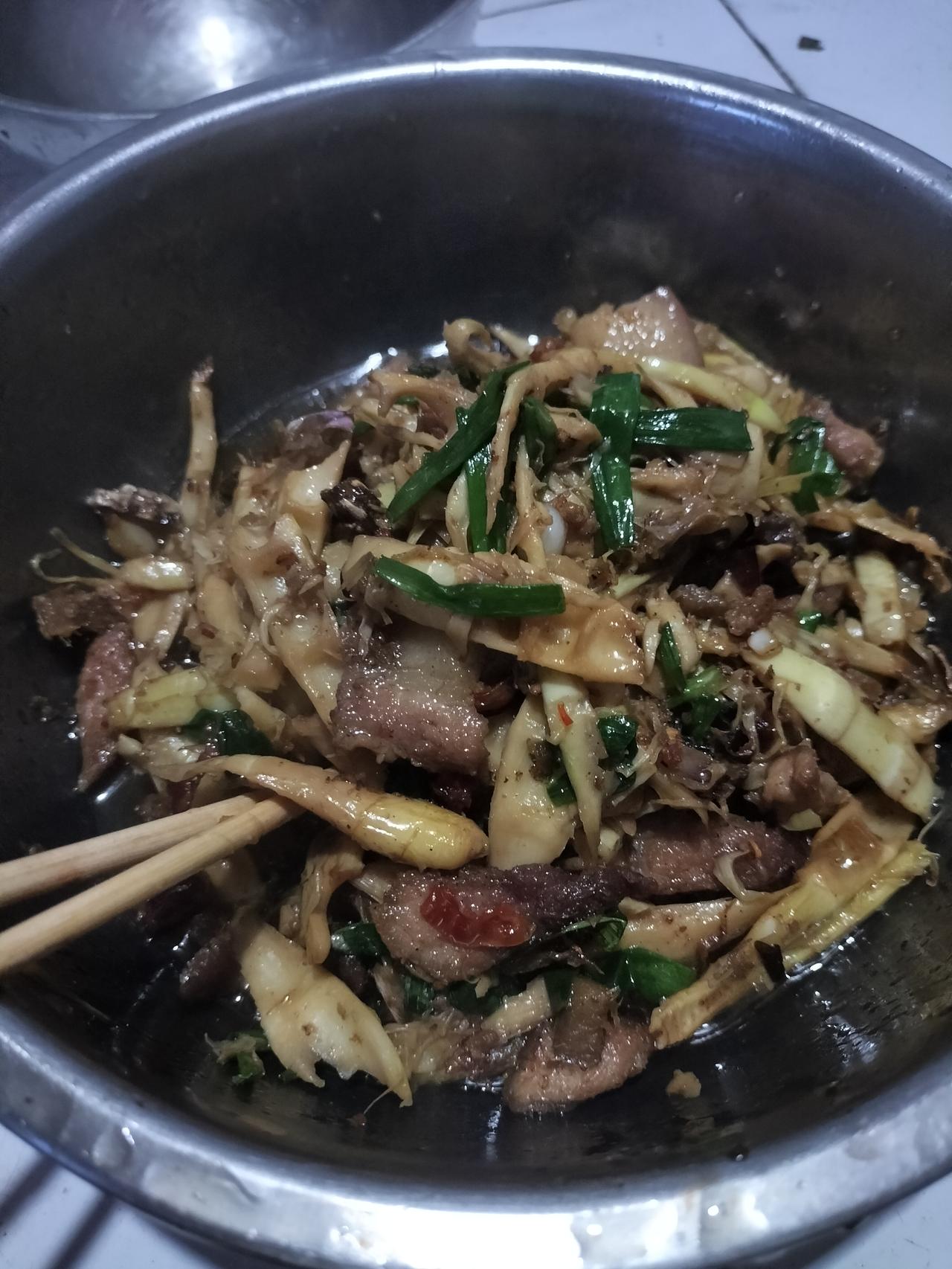 其实步骤是对的,先把春笋焯水,捞出来,再炒猪肉,最后倒入锅里一起翻炒,快炒熟的时候,我发现没有葱,又关掉火,跑去菜地里摘一把葱来,那个绿油油的就是葱。