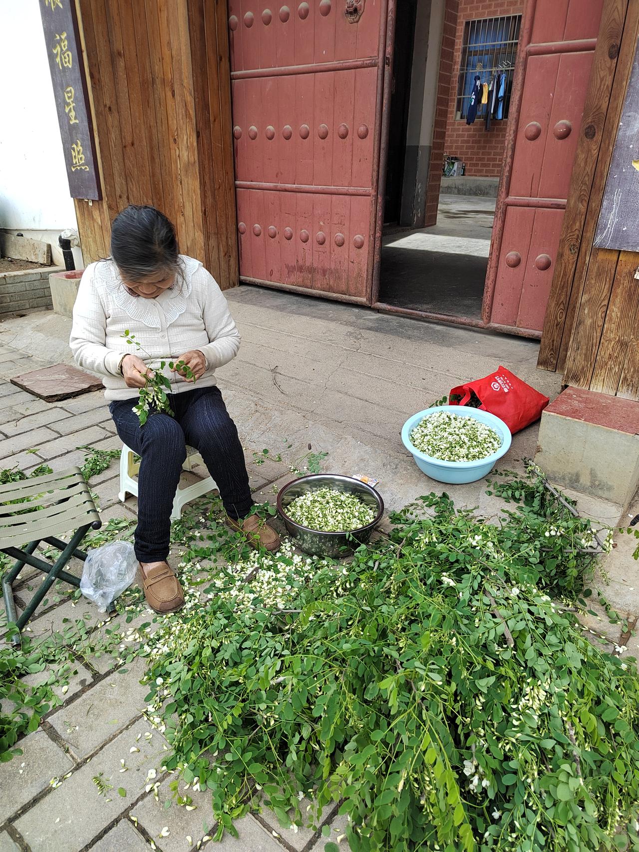 这村子非常漂亮,街道整齐,家家门口红灯髙挂。有人拿着笼子钩子出门去够槐花,有女人坐在门前,从槐树枝桠上摘槐花。村子尽头看到标有陕西棋院牌子的院落,但大门紧闭。