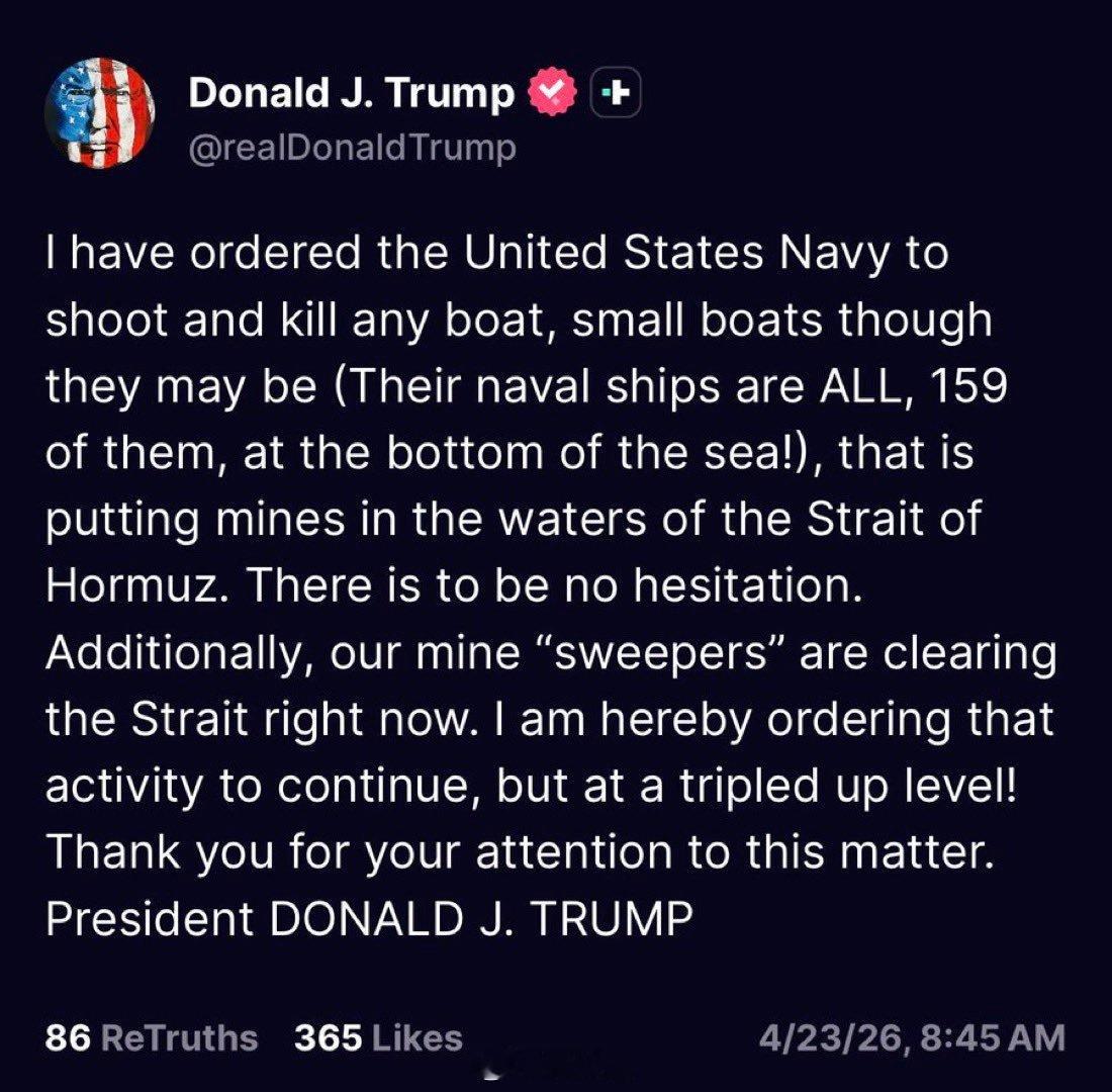特朗普昨天发帖称,伊朗海军159艘船只全部在海底。意思是,他现在怕的不是伊朗海军,而是伊朗海军布设的水雷。
