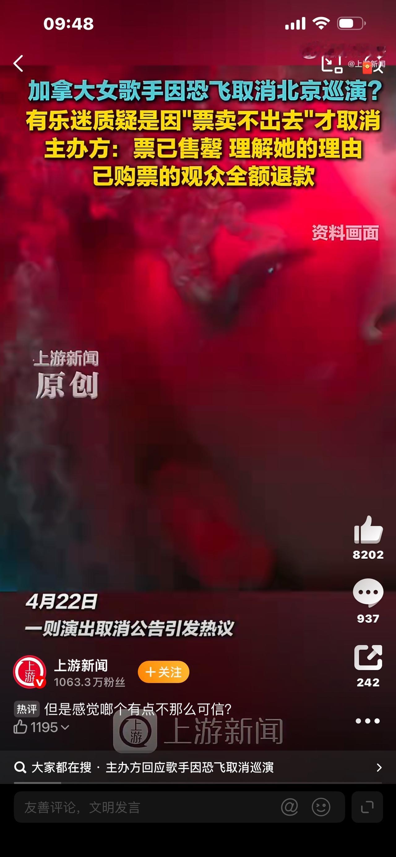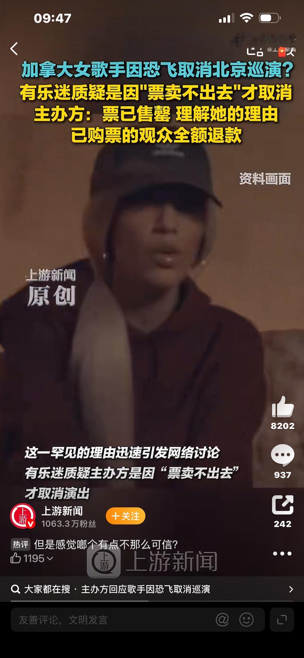 事情相信大家都刷到了,加拿大一位人气女歌手原定4月30日在北京开巡演,距离演出只剩一周,主办方突然发布公告,直接宣布演出取消。很多粉丝早就抢好票、安排好行程,满心期待等着赴约,突如其来的取消,瞬间让无数乐迷满心失望。