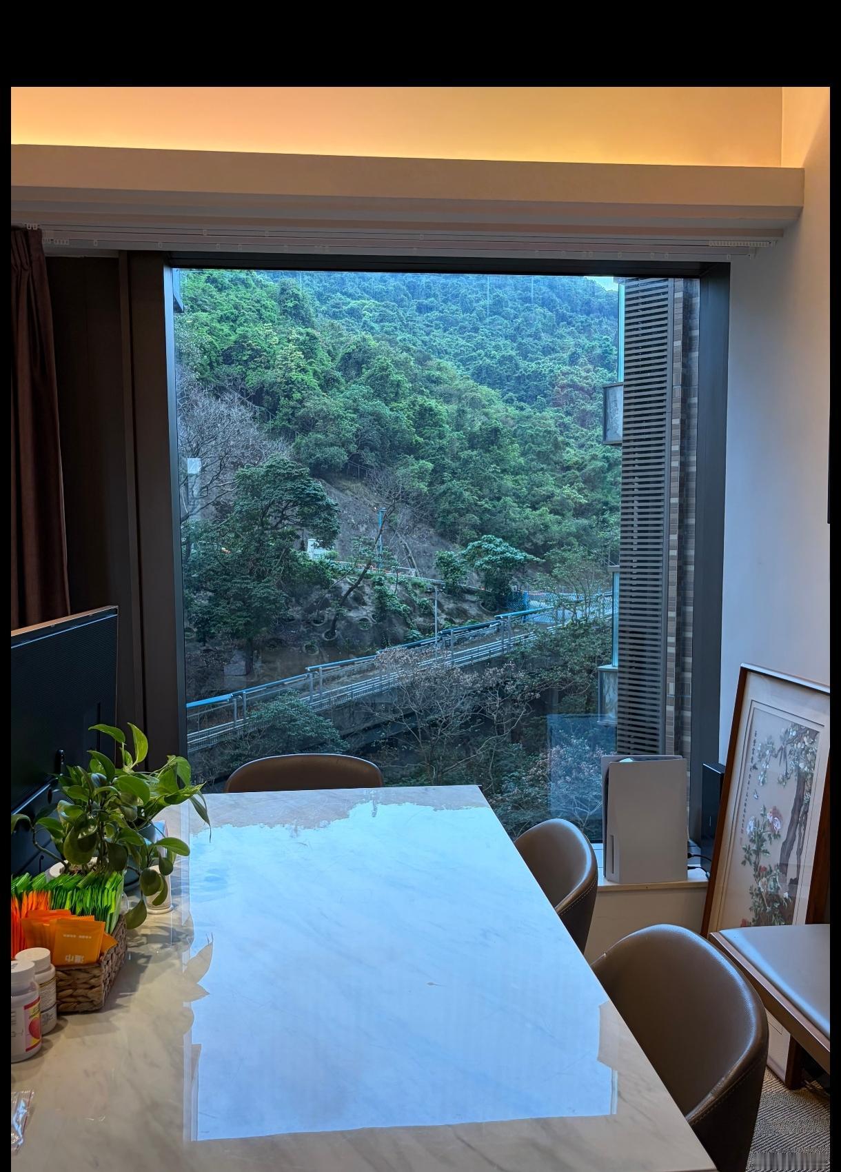 香港寸土寸金,住宿区多高层,有的紧邻着山,坐家望林,满目绿色。像这种三房两厕,交