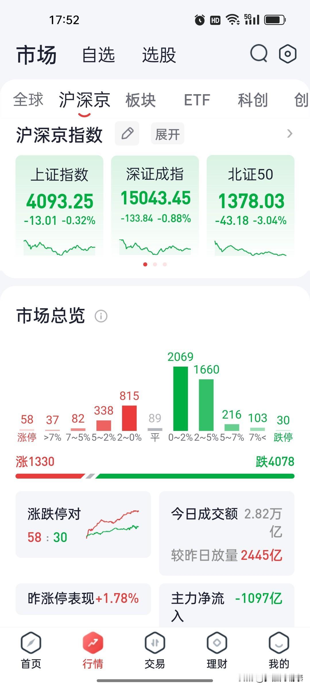 涨跌家数对比:今日上涨仅1628家,下跌高达3751家,市场个股普跌格局延续;跌幅超2%的个股数量,相比昨日全天明显减少,资金恐慌抛压有所收敛,没有出现大面积极端杀跌。