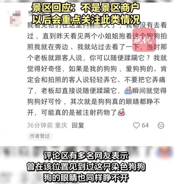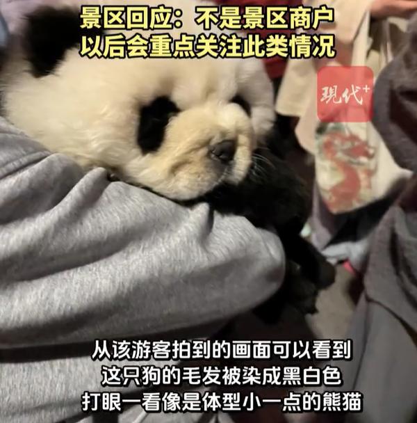 “收费是20元一次,不限时间。”这名游客告诉记者。这只狗狗全身都被染色,可能是受染料影响,眼睛睁不开。脑袋耷拉着,看上去没什么活力,毫无反抗地被游客摆弄拍照。一开始以为狗是困了,但听说这只狗已经在这里做了很久的拍照道具,每天都是这副没有活力的样子,可能是担心狗伤人,好像牙齿也没有了。从游客拍摄到的现场画面中可以看到,这只狗染色后,乍一看很像体型较小的熊猫。有网友在评论区表示,这只狗的品种像是松狮,看上去年龄也不大。这组照片引发网络热议,不少网友担心此举可能对狗的健康有危害,也呼吁游客不要去拍照消费。