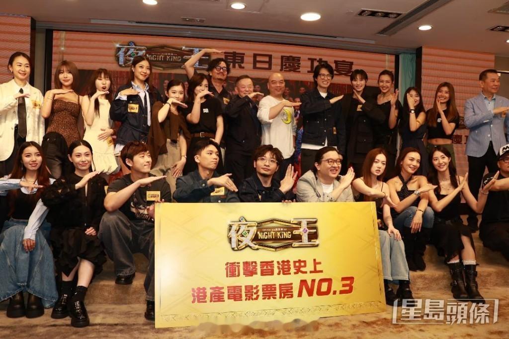 电影《夜王》上映以来成绩很好,截至4月23日晚上8时,票房共1.1242亿,昨晚于尖沙咀举行庆功宴,导演吴炜伦、黄子华、杨偲泳、李芯駖、何启华、卢镇业等都有出席,与台前幕後齐齐庆祝,吴炜伦在台上分享时,指《夜王》还差几十万,就能超越《九龙城寨之围城》,成为香港华语票房榜第三位,黄子华笑指导演今晚是来和大家筹旗,又送上打火机为导演打气,祝愿《夜王》能打赢《毒舌大状》。
