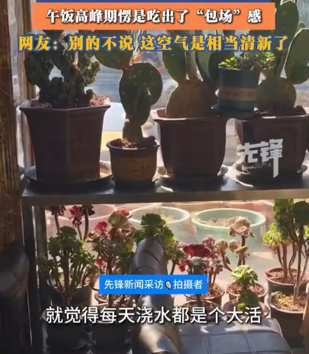 【男子走进饭店发现花比人多】男子午饭高峰被花花草草包围了 近日,黑龙江哈尔滨。男子偶入一家饭店,午饭高峰期愣是吃出了“包场”感——因为全场最忙的,是角落里的浇花水壶。男子称,店内的绿植有几十盆,可见老板对种花种草是真爱。(先锋新闻)