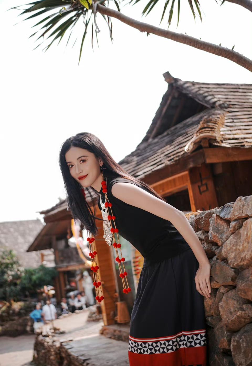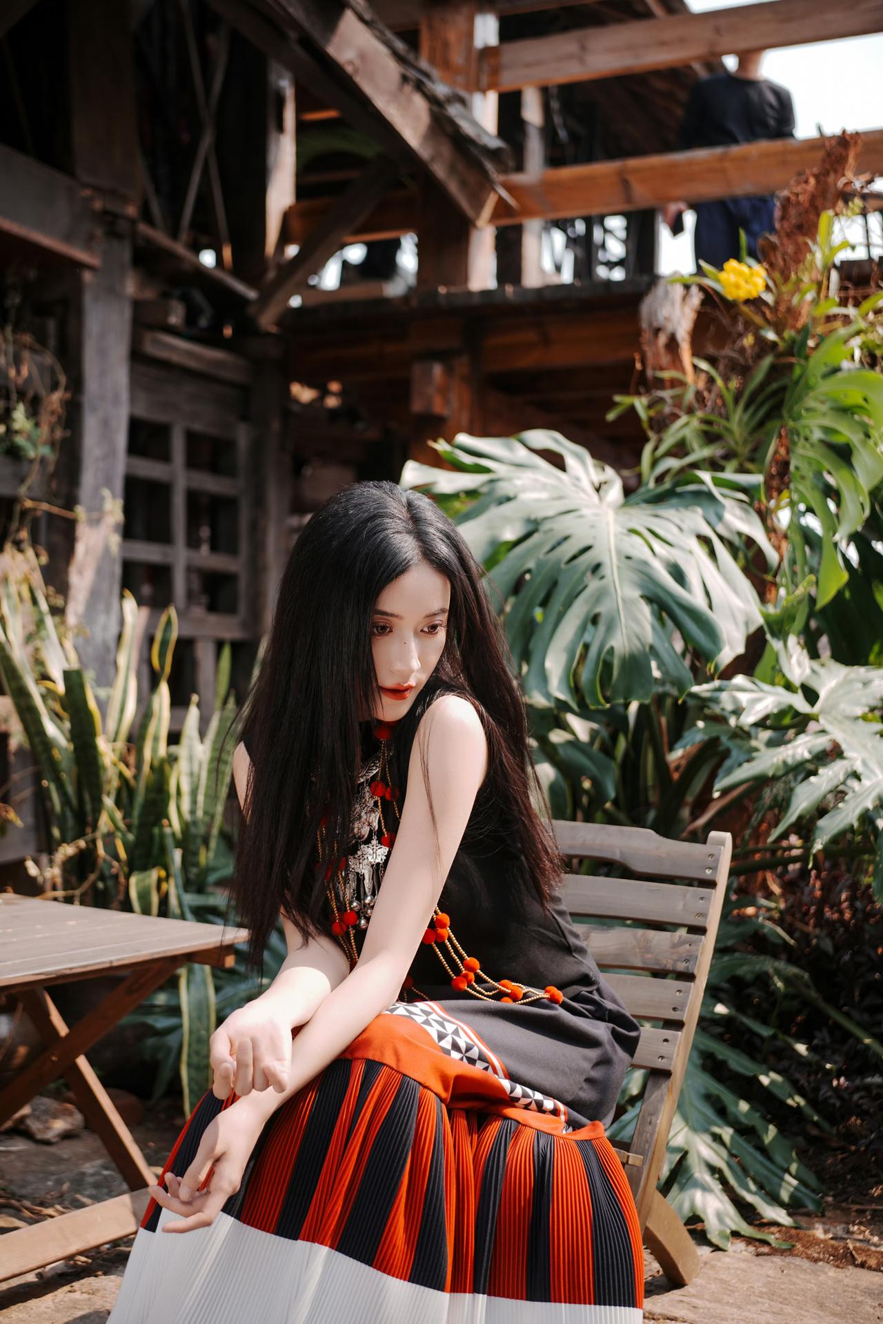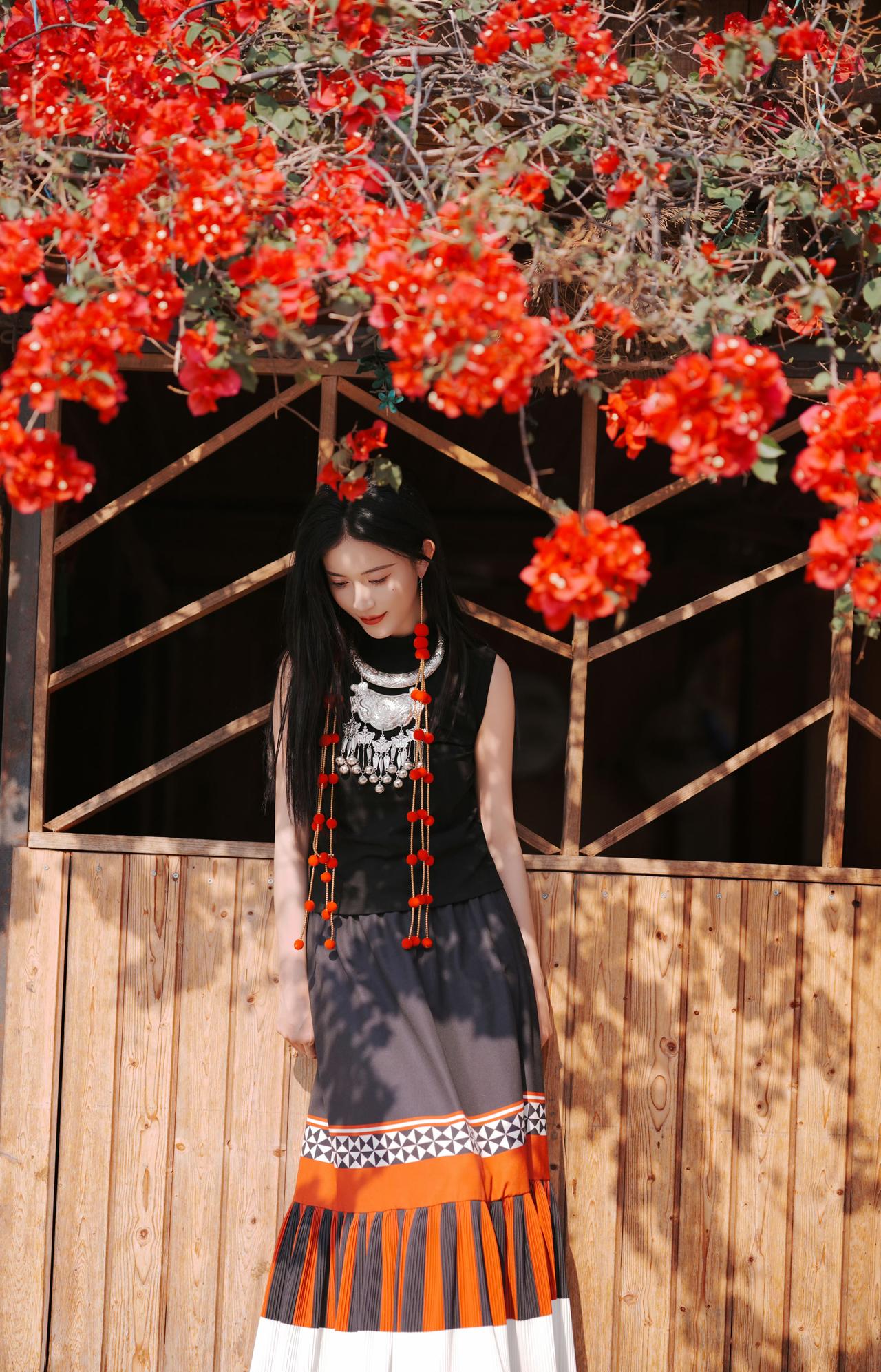 古寨木屋间,三角梅开得正好,民族风的独特纹样在裙摆流转,长发与山风轻轻缠绕。