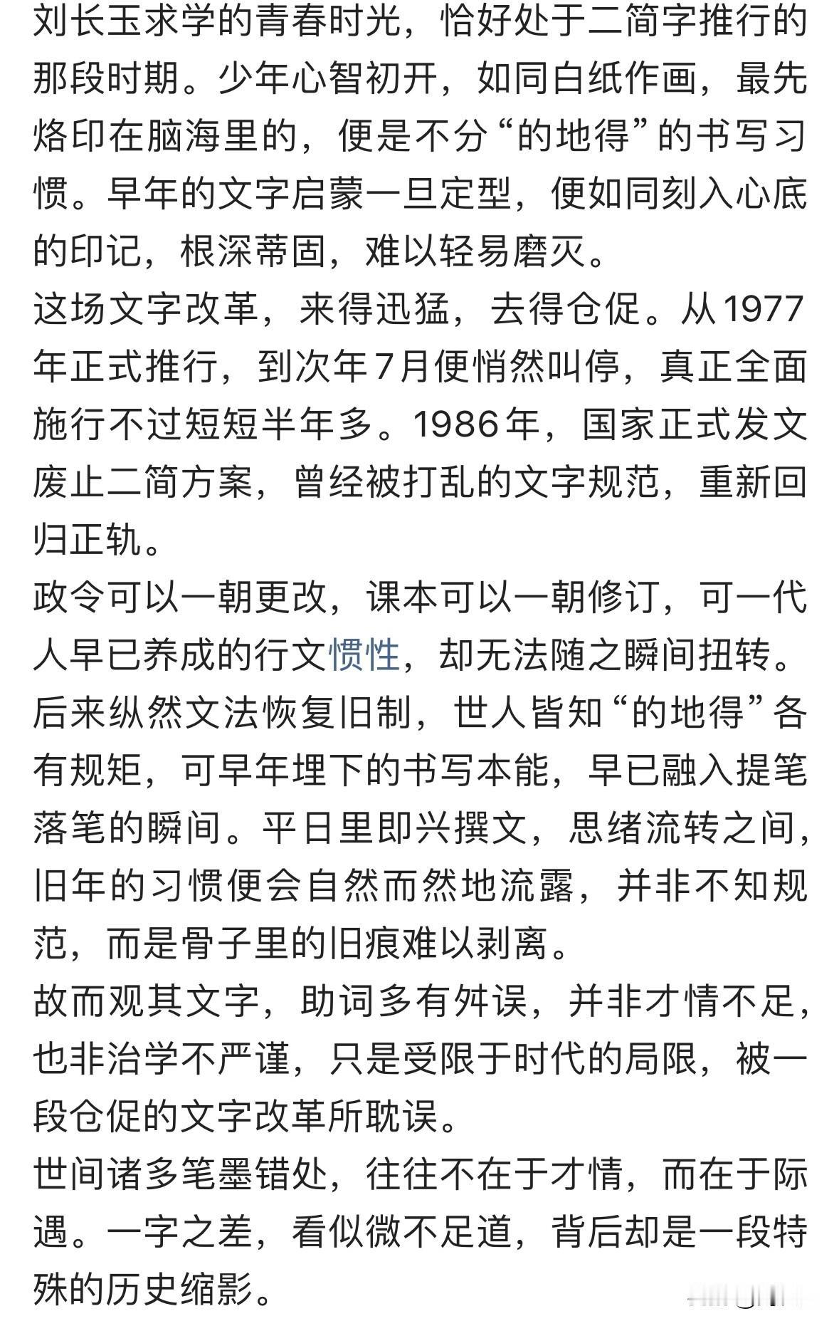 文章清晰阐明三字的语法分工,点明汉语言千年文法逻辑,同时结合时代现实,道出特殊文字改革对一代人启蒙书写的深远影响。以时代烙印解释习惯成因,理性共情,不苛责、不偏激。既尊重汉语规范,又体谅一代人的时代局限,情理兼备,逻辑严谨,让人读懂文字误差背后的历史缘由,极具说服力。